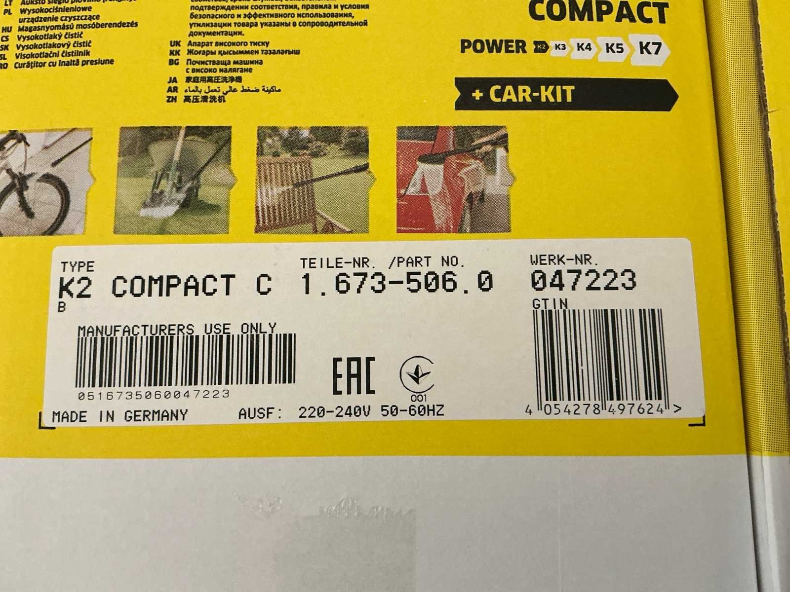 Product zit ongebruikt in de originele verpakking Merk: Kärcher Type: K2 compact + car kit Serienummer: 4054278497624 Maximale werkdruk: 110bar Capaciteit.: 360l/hr