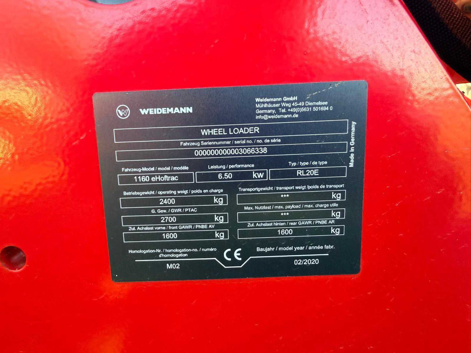 Onboard lader 230V Accu: 300Ah hef vermogen: 1200kg Hydraulische snelwissel 4-wiel hydrostatische aandrijving Bediening dmv multifunctionele hendel T80 assen met cardanas Banden: 31x15.5-15 AS ( 132cm breed) Geveerde comfort zitting een hendel bediening 3e functie voorzijde werklampen voor/achter bedrijfs urenteller digitaal armsteun rechts contra gewicht geintregeerd , bumper model Merk: Weidemann Type: 1160 Bouwjaar: 2020 Kenteken: T-78-BDZ Brandstof: elektriciteit Cabine: true Afgelezen urenstand: 845 Eigen gewicht: 2400kg
