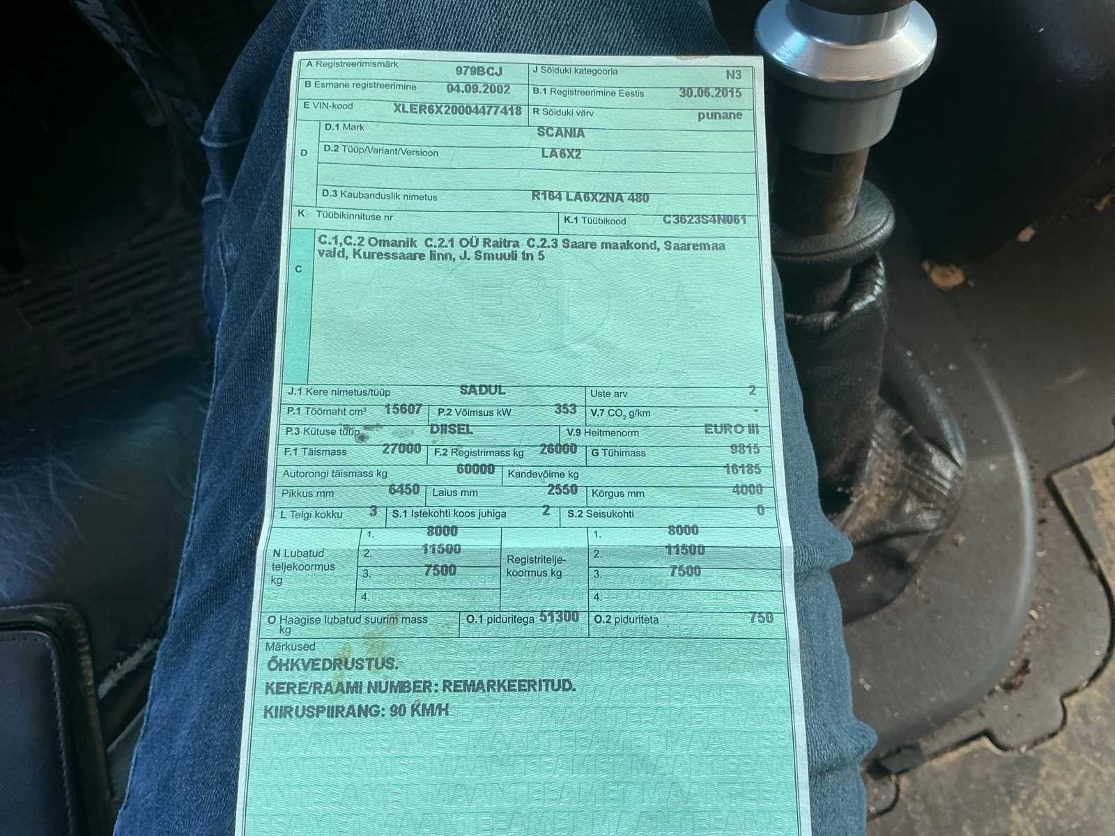 Estland Registratie documenten; Merk: Scania LA6X2NA Type: R146 / 480 Bouwjaar: 2002 Chassisnummer VIN: XLER6X20004477418 Kilometerstand bij opname: 63407km Slaapcabine: true Gesloten opbouw: true Aantal zitplaatsen: 2