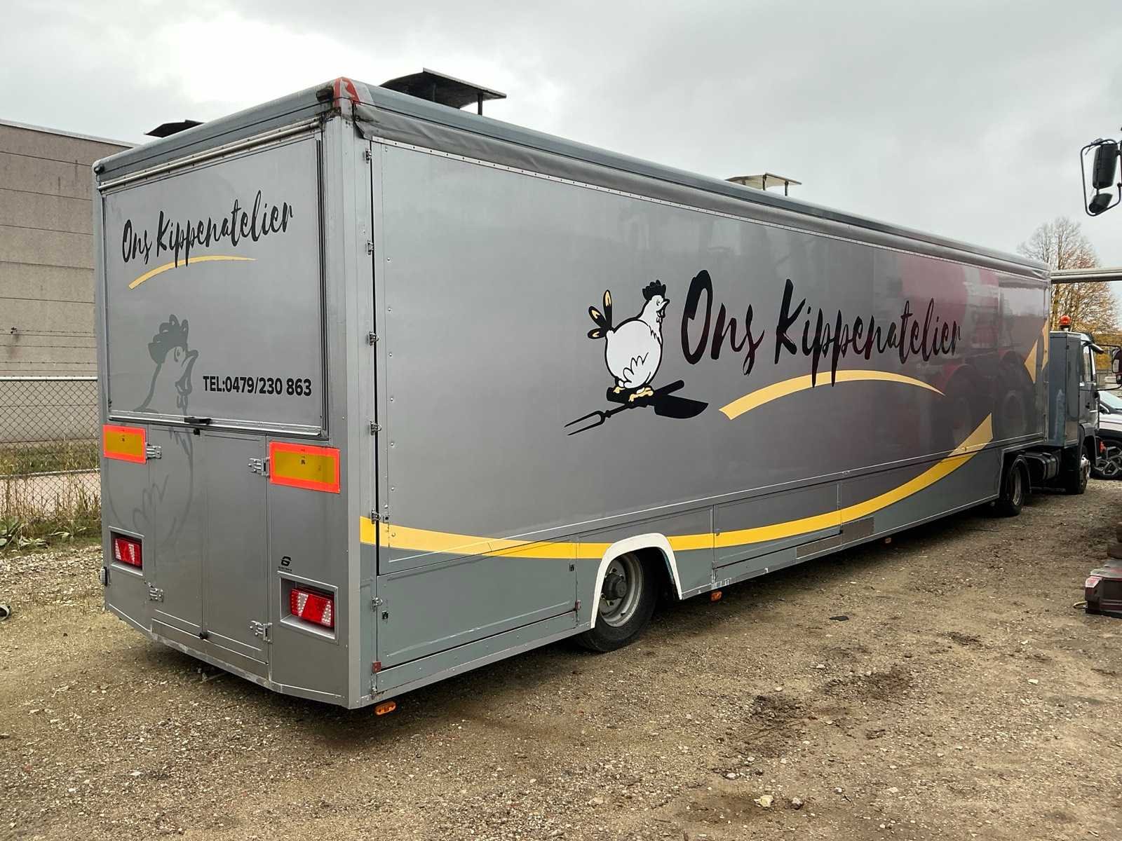 Belgische documenten; Lengte combinatie totaal circa 14,2 meter. Marktwagen Tracon Uden TO.4.5 chassisnr XL9TRA1139082522/97 voorzien van 3 koeldeuren, frituur, afzuigkap, wasbak met kraan, verlichting en Mettler Toledo kassaweegschalen. Merk: MAN Bouwjaar: 2000 Chassisnummer VIN: WMAL341777G139821 Kilometerstand bij opname: 200900km Asconfiguratie: 4x2 Slaapcabine: true Gesloten opbouw: true Aantal zitplaatsen: 2 Handgeschakelde versnellingsbak: true No self drive export!: true