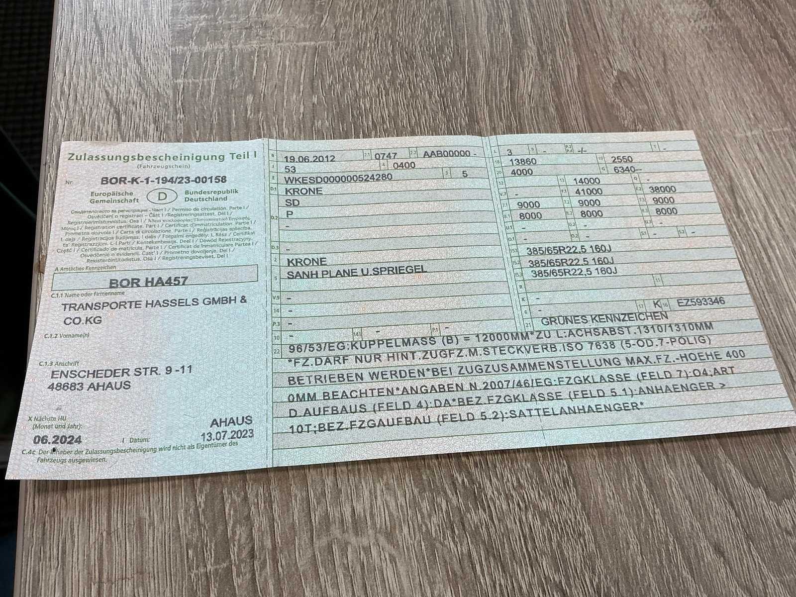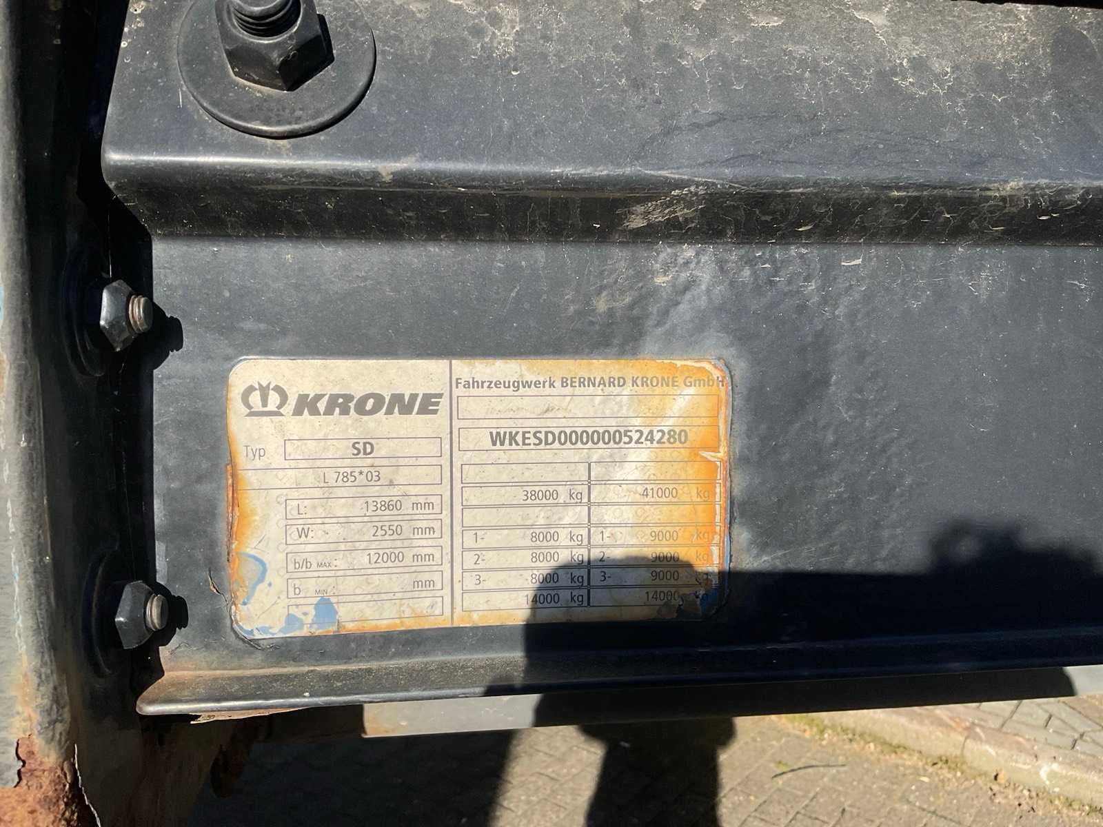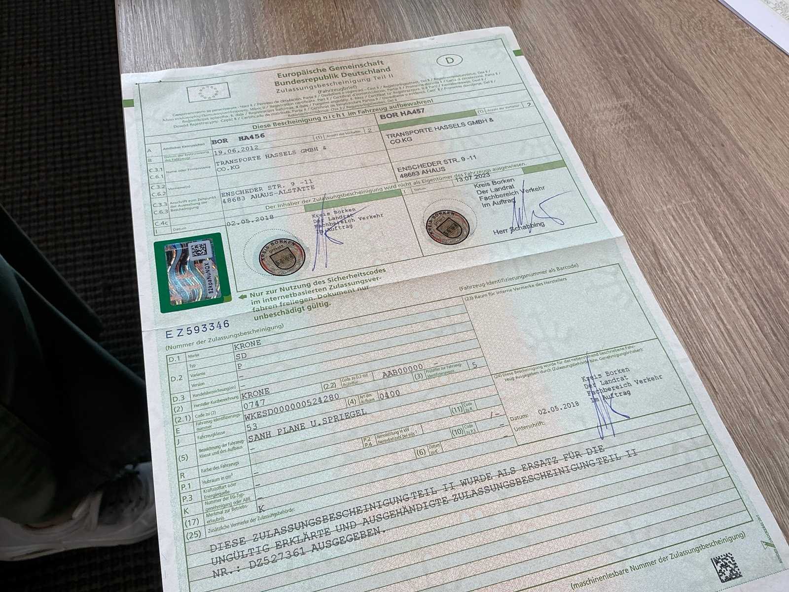 Duitse registratie documenten; Merk: Krone Type: SD Chassisnummer VIN: WKESD000000524280 Aantal assen: 3