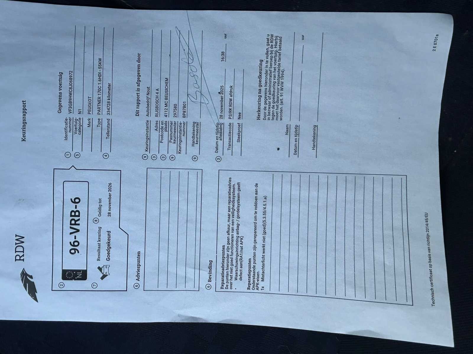 Motor schade; transport schade; Kenteken: 96-VRB-6 Merk: Peugeot Type: 170C 1.6 HDI Model: Partner Chassisnummer: VF3GB9HWC8J068972 Afgelezen kilometerstand: 334788km Cilinderinhoud: 1560cc Vermogen (kW): 55kW Brandstof: Diesel Datum eerste toelating: 2008-05-30 APK vervaldatum: 2026-11-28 Aandrijving: Voorwiel Transmissie: Handgeschakeld (null) Aantal zitplaatsen: 2 Kleur: niet van toepassing Ledig gewicht: 1194kg Vermogen (pk): 74 Aantal cilinders: 4 Carrosserie: Gesloten opbouw Emissieklasse: 4 Maximaal trekgewicht ongeremd: 597