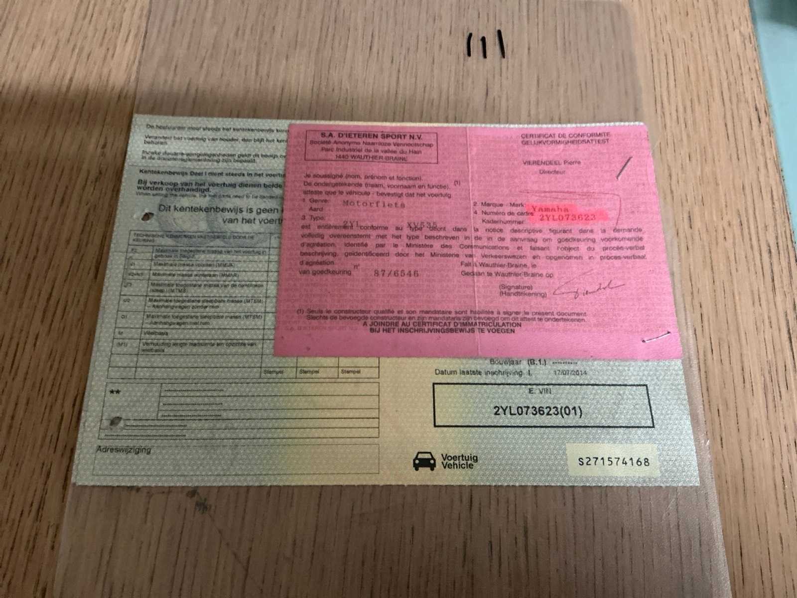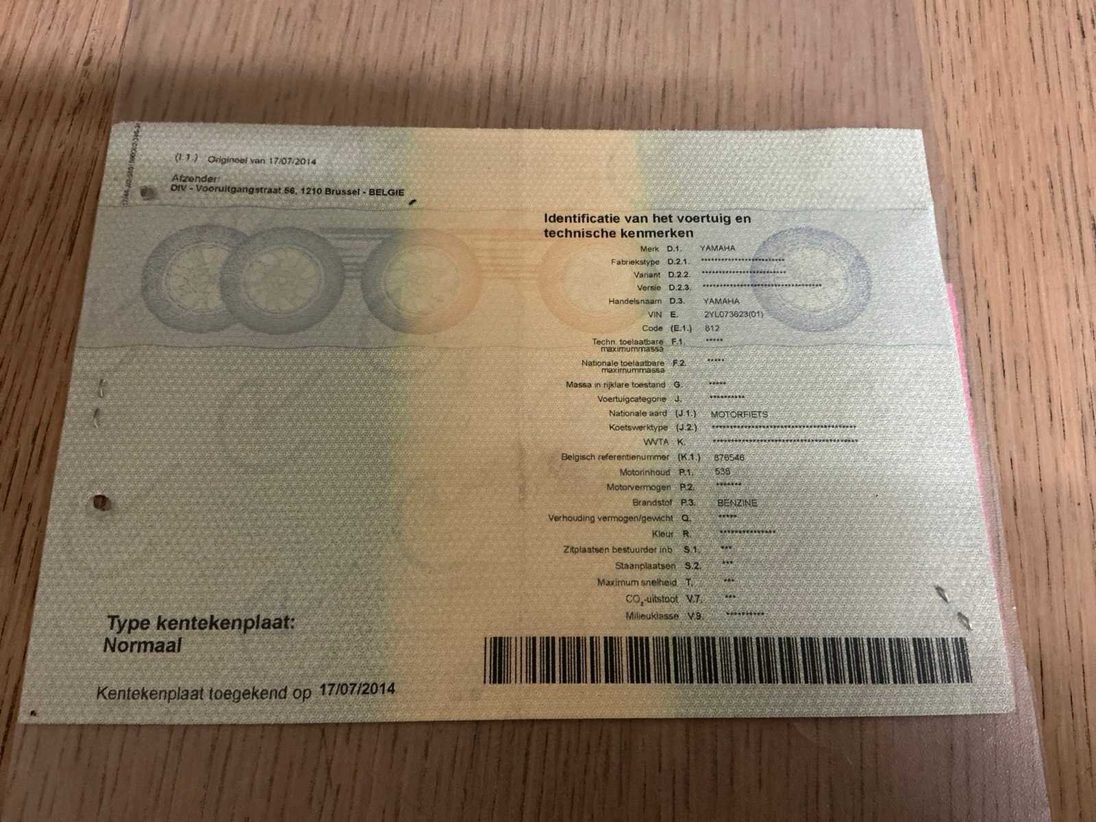 Let op: Belgisch kenteken documenten; Merk: Yamaha Model: XV535 Type: 2YL Virago Brandstof: Benzine Chassisnummer: 2YL073623 Datum eerste toelating: 1992 Afgelezen kilometerstand: 16830km