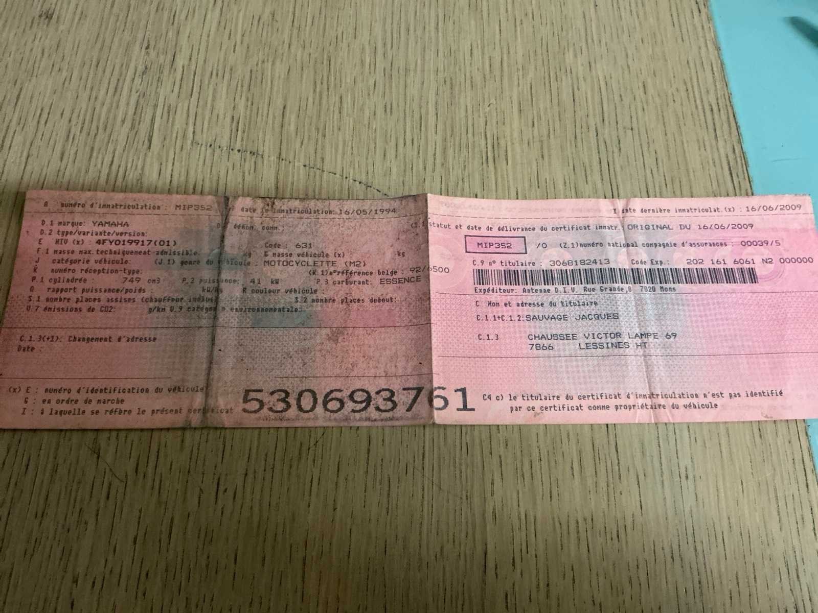 Let op: Belgisch kentekenbewijs; Merk: Yamaha Model: Chopper Type: Virago Brandstof: Benzine Chassisnummer: 4FY019917 Cilinderinhoud: 749cc Datum eerste toelating: 1994 Afgelezen kilometerstand: 36897km