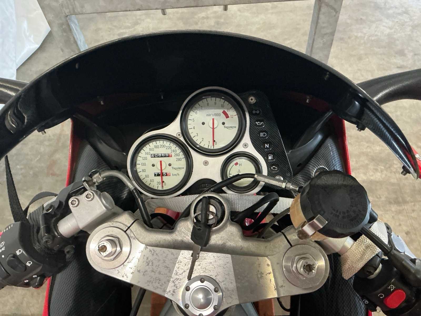 Merk: Triumph Model: Sport Type: T595 Kenteken: MH-NR-26 Brandstof: benzine Cilinderinhoud: 995cc Datum eerste toelating: 1998-11-16 Vermogen (kW): 72kW Kleur: niet van toepassing Afgelezen kilometerstand: 40865km Transmissie: Handgeschakeld Datum eerste toelating (NL): 2003-02-28 Bruto BPM (NL): 1779€ Rest BPM: 0€ Bouwjaar: 1998