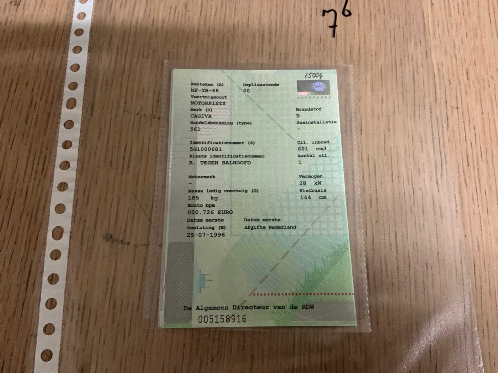 Let op: Slapend kenteken, (is weer actief te maken bij de RDW door een kentekenkeuring) Merk: Cagiva Model: All-Road Type: Canyon Kenteken: MF-TB-68 Brandstof: benzine Cilinderinhoud: 601cc Datum eerste toelating: 1996-07-25 Vermogen (kW): 28kW Kleur: niet van toepassing Afgelezen kilometerstand: 1339km Transmissie: Handgeschakeld Rest BPM: 0€ Bruto BPM (NL): 726€ Bouwjaar: 1996