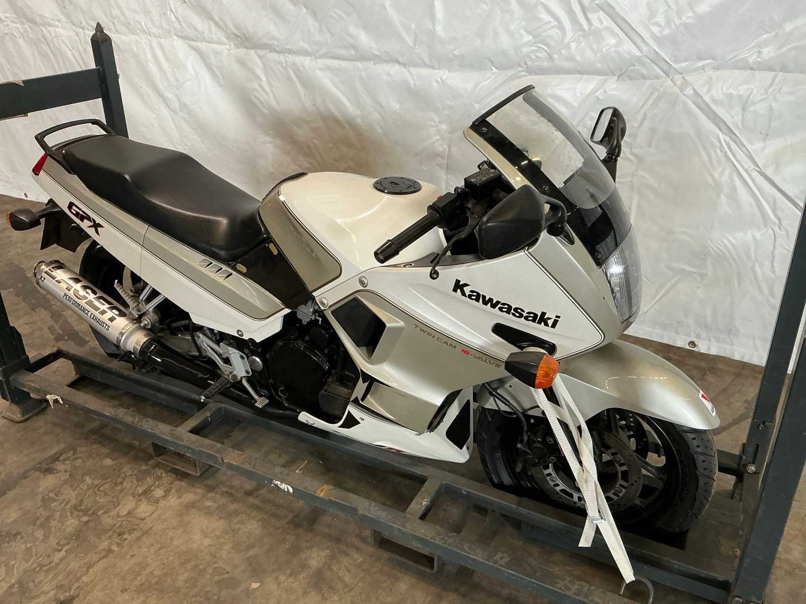 Merk: Kawasaki Model: Sport Type: GPX 700 R Kenteken: MJ-70-DK Brandstof: benzine Cilinderinhoud: 748cc Datum eerste toelating: 1989-06-15 Vermogen (kW): 78kW Kleur: niet van toepassing Afgelezen kilometerstand: 27983km Transmissie: Voetgeschakeld Datum eerste toelating (NL): 1989-06-15 Bruto BPM (NL): 0€ Bouwjaar: 1989