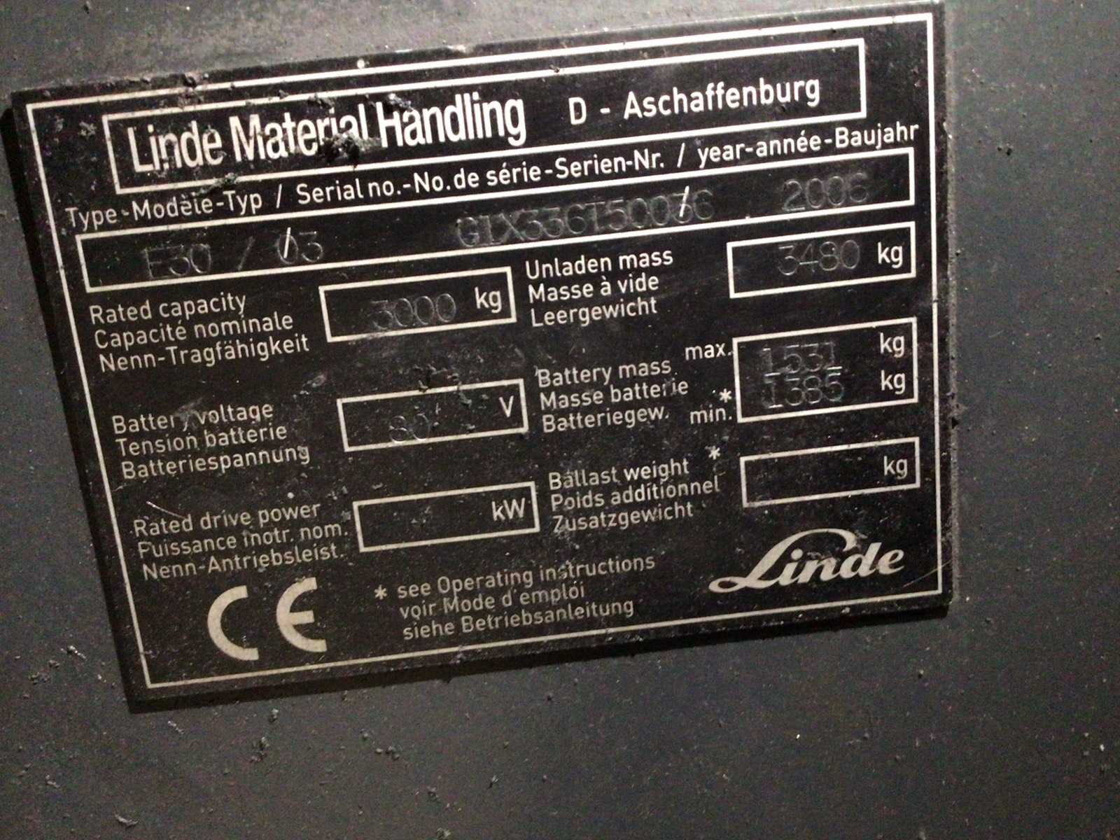 Merk: Linde Type: E30/03 Bouwjaar: 2006 Serienummer: G1X336T50036 Brandstof: Elektrisch Mast: Triple Soort band: Volrubber banden Aantal wielen: 4 Afgelezen urenstand: 16056 Accu lader: true Free-lift: true Side-shift: true Duplex mast: true Eigen gewicht: 5000kg Hefvermogen: 3000kg Lepellengte: 1500mm Max. hefhoogte: 4500mm Hefhoogte: 4500mm Minimale doorrijhoogte: 2250mm Totale afmeting L: 4000mm Totale afmeting Breedte: 1200mm Totale afmeting Hoogte: 2250mm