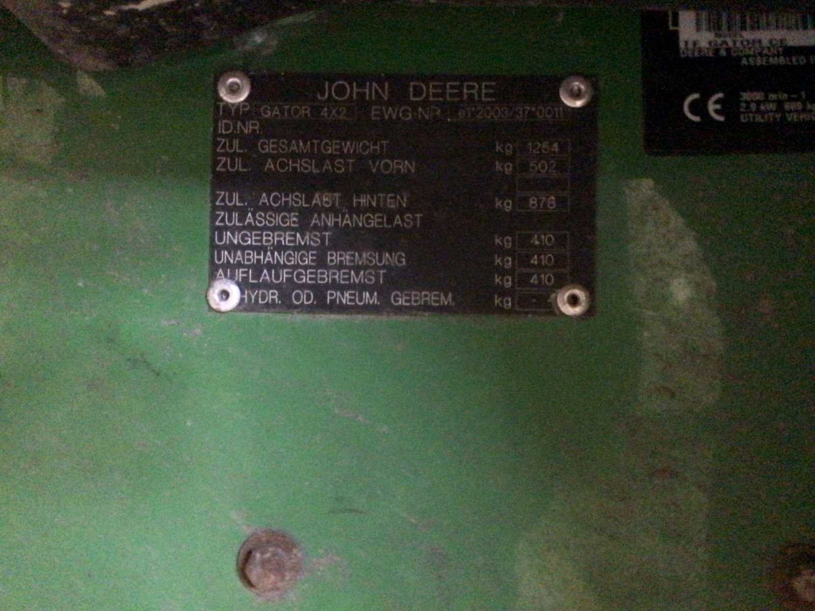 Merk: John deere Type: Gator 4x2 Bouwjaar: 2003 Serienummer: e1*2003/37*0011 Elektrisch: true Trekcapaciteit: 410kg Eigen gewicht: 1254kg Totale afmeting L: 2800mm Totale afmeting Breedte: 1600mm Totale afmeting Hoogte: 1820mm