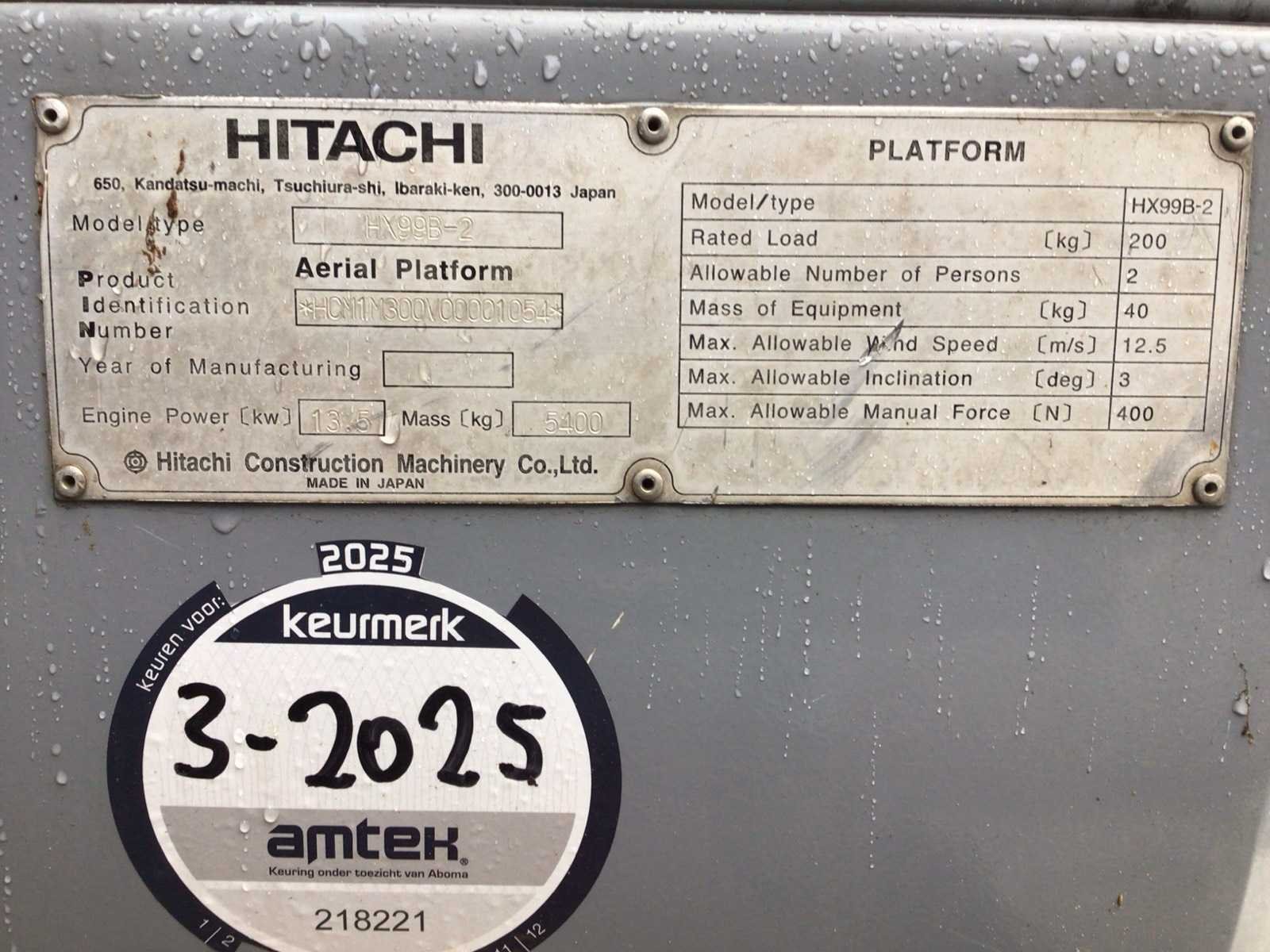 Merk: Hitachi Type: HX99B-2 Serienummer: *HCM1M300V00001054* Diesel: true Telescoop hoogwerker: true Werkhoogte: 9700mm Horizontale rijkwijdte: 4000mm Plateau afm. l: 11005mm Plateau afm. b: 1550mm Platform capaciteit: 200kg Afgelezen urenstand: 50081 Eigen gewicht: 5400kg Totale afmeting L: 5000mm Totale afmeting Breedte: 2000mm Totale afmeting Hoogte: 2500mm