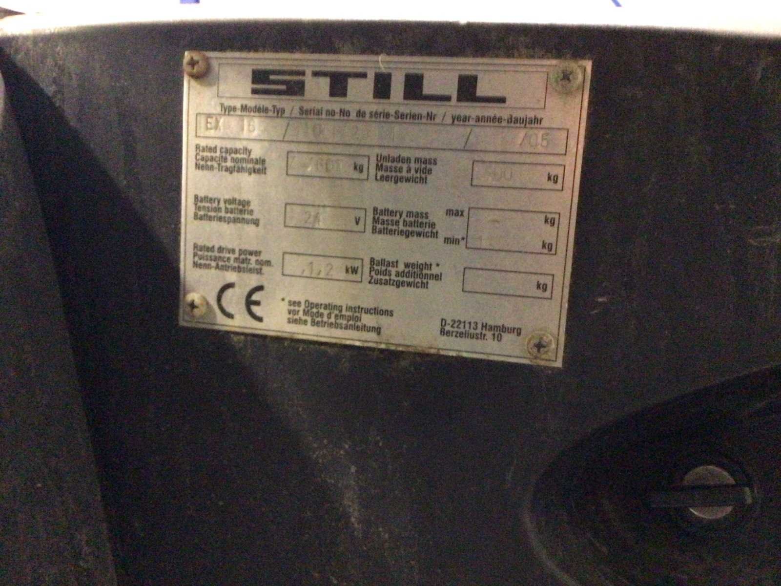 Merk: Still Type: EXU16 Bouwjaar: 2005 Serienummer: 710140200814 Hefvermogen: 1600kg Lepellengte: 1200mm Accu lader: true Afgelezen urenstand: 5101 Eigen gewicht: 700kg Totale afmeting L: 1800mm Totale afmeting Breedte: 750mm Totale afmeting Hoogte: 1400mm