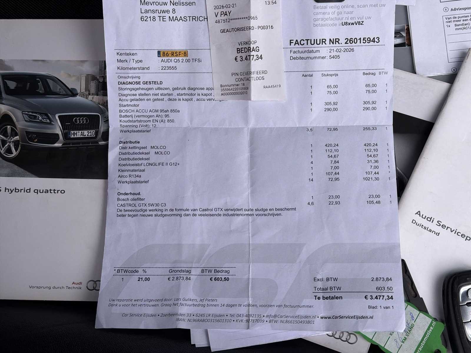 S-LINE | CRUISE | NAVI | BANG & OLUFSEN | STOELVERWARMMING Kenteken: 86-RSF-8 Merk: Audi Model: Q5 Type: 2.0 TFSI q. PL.S Bouwjaar: 2011 Afgelezen kilometerstand: 224667km Cilinderinhoud: 1984cc Vermogen (kW): 155kW Brandstof: Benzine Chassisnummer: WAUZZZ8R9CA009716 NAP status: Logisch Datum eerste toelating: 2011-07-15 APK vervaldatum: 2026-07-21 Vermogen (pk): 208hp Aandrijving: AWD Aantal zitplaatsen: 5 Maximaal trekgewicht ongeremd: 750kg Maximaal trekgewicht geremd: 2000kg Kleur: zwart Transmissie: Automaat Emissieklasse: 5 Aantal deuren: 4 Aantal sleutels: 2 Ledig gewicht: 1730kg Bruto BPM (NL): 15793€ Aantal cilinders: 4 Carrosserie: SUV Carfax Link: https://was.carfax.eu/v0/api/ccdid/5100016408/svc/201/vinreg/86RSF8/checksum/eyJhbGciOiJIUzI1NiIsInR5cCI6IkpXVCJ9.eyJleHAiOjE3ODA5ODk2ODV9.XolFMY-IdgmOvXAOaU9ssR3fYQH_RXsKvR3Q5njLjeY startinformatie : Start en rijdt Self drive export possible : true Airconditioning: true Navigatie: true Xenon verlichting: true LED-koplampen: false