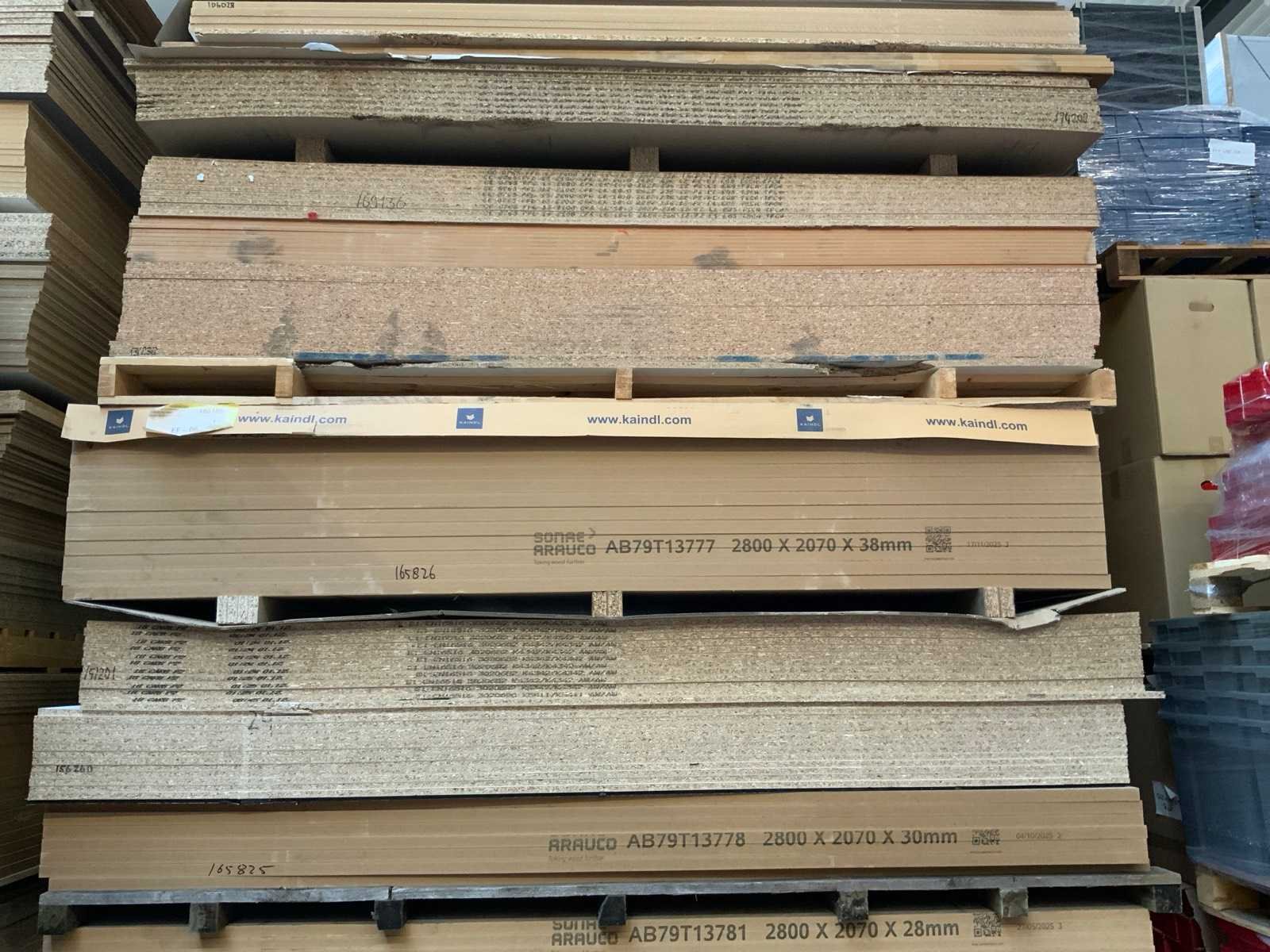Platen zijn ca 2800x2070x20/28/38mm; afmetingen kunnen afwijken; decoratie spaanplaat; sommige dubbelzijdig gelamineerd; past in 1 tautliner; 8 pakken; stapel met gele sticker nummer 8;
