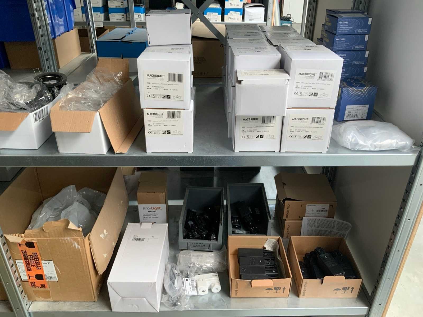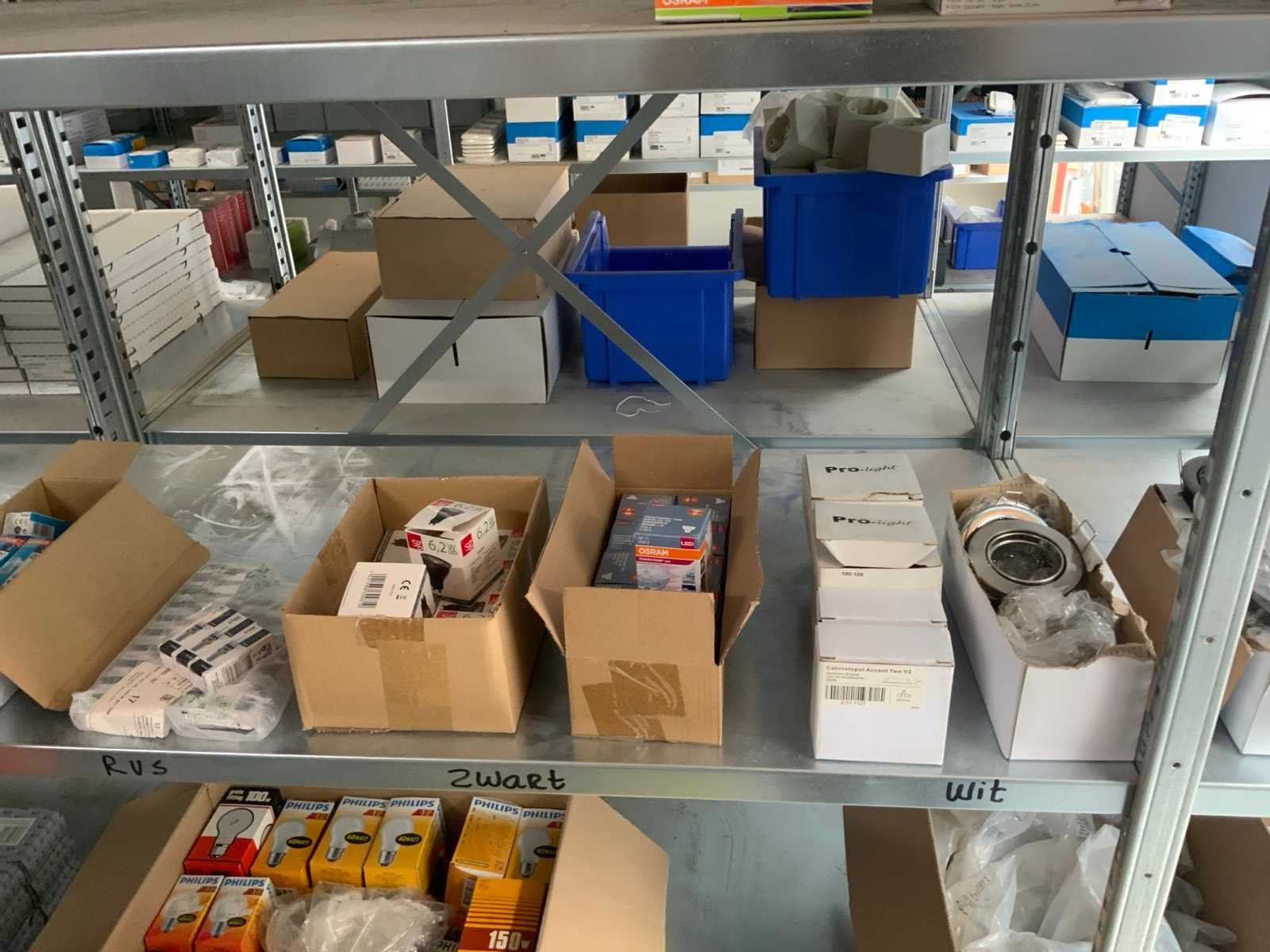 Waaronder: starters, inbouw spots, MACBRICHT halogeenlampen, railsspot koppelmateriaal, 2 rollen vloerisolatie. verdeeld over 8 vakken