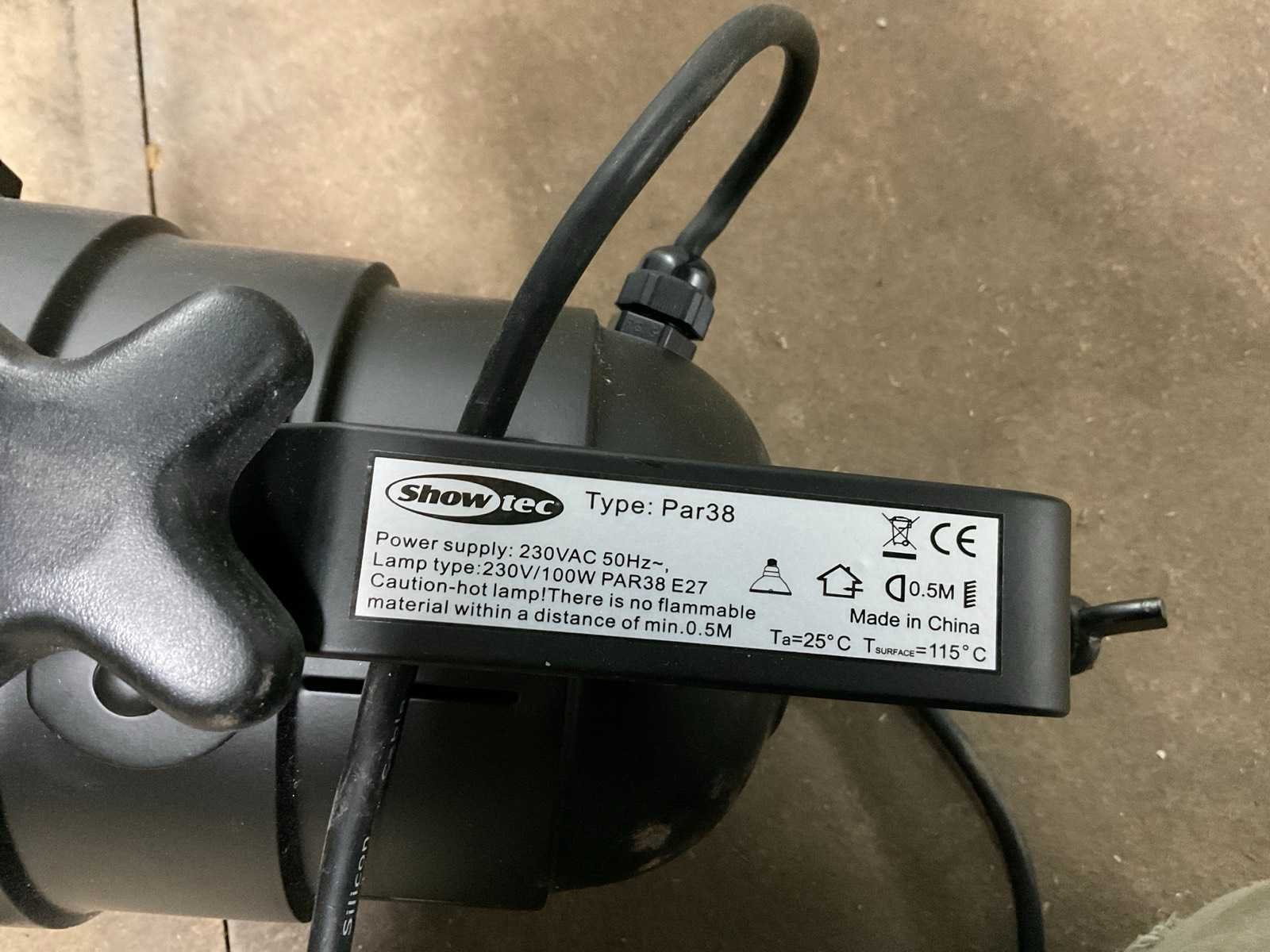 Merk: Showtec Model: Par38 Verstelbaar: true Fitting: E27 Dimbaar: true Wattage: 100W Kleur: Zwart Lengte: 17cm Breedte: 17cm Hoogte: 22cm Materiaal: Alluminium