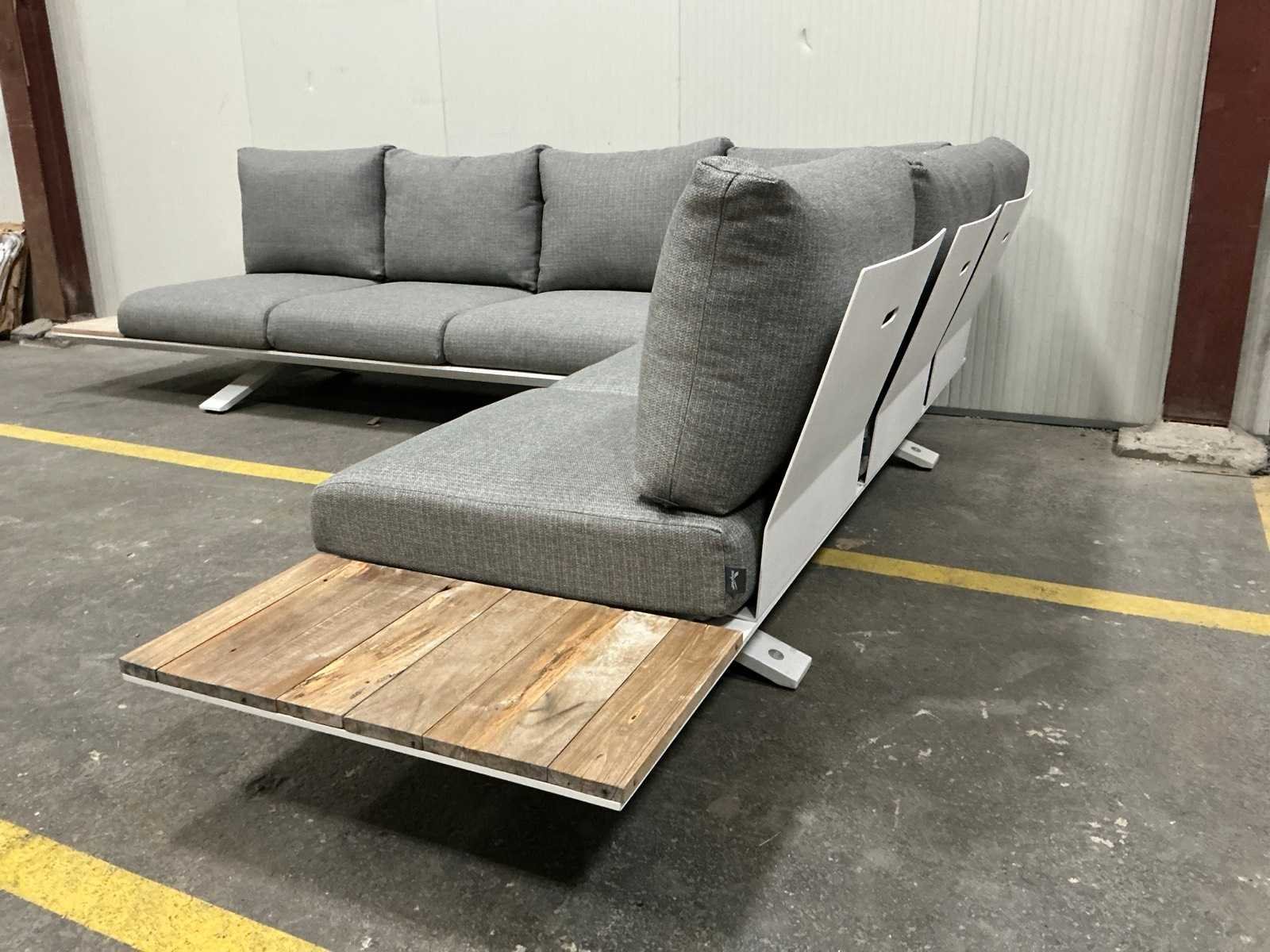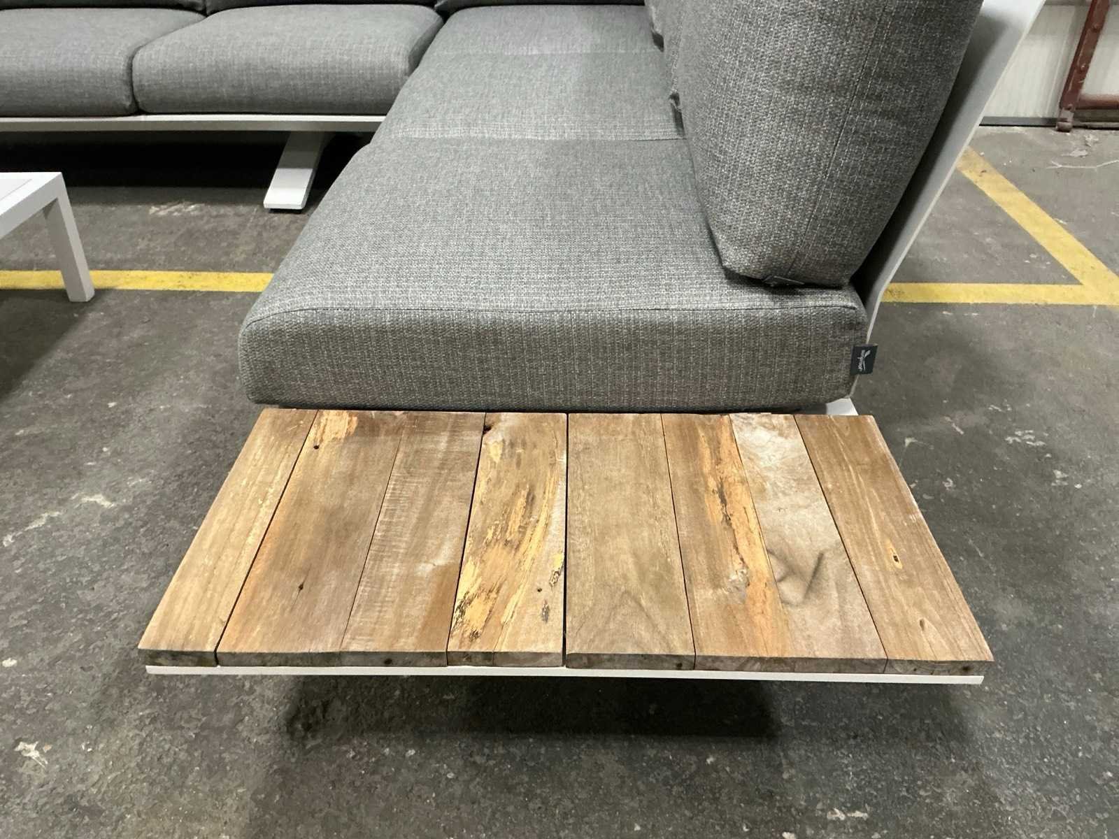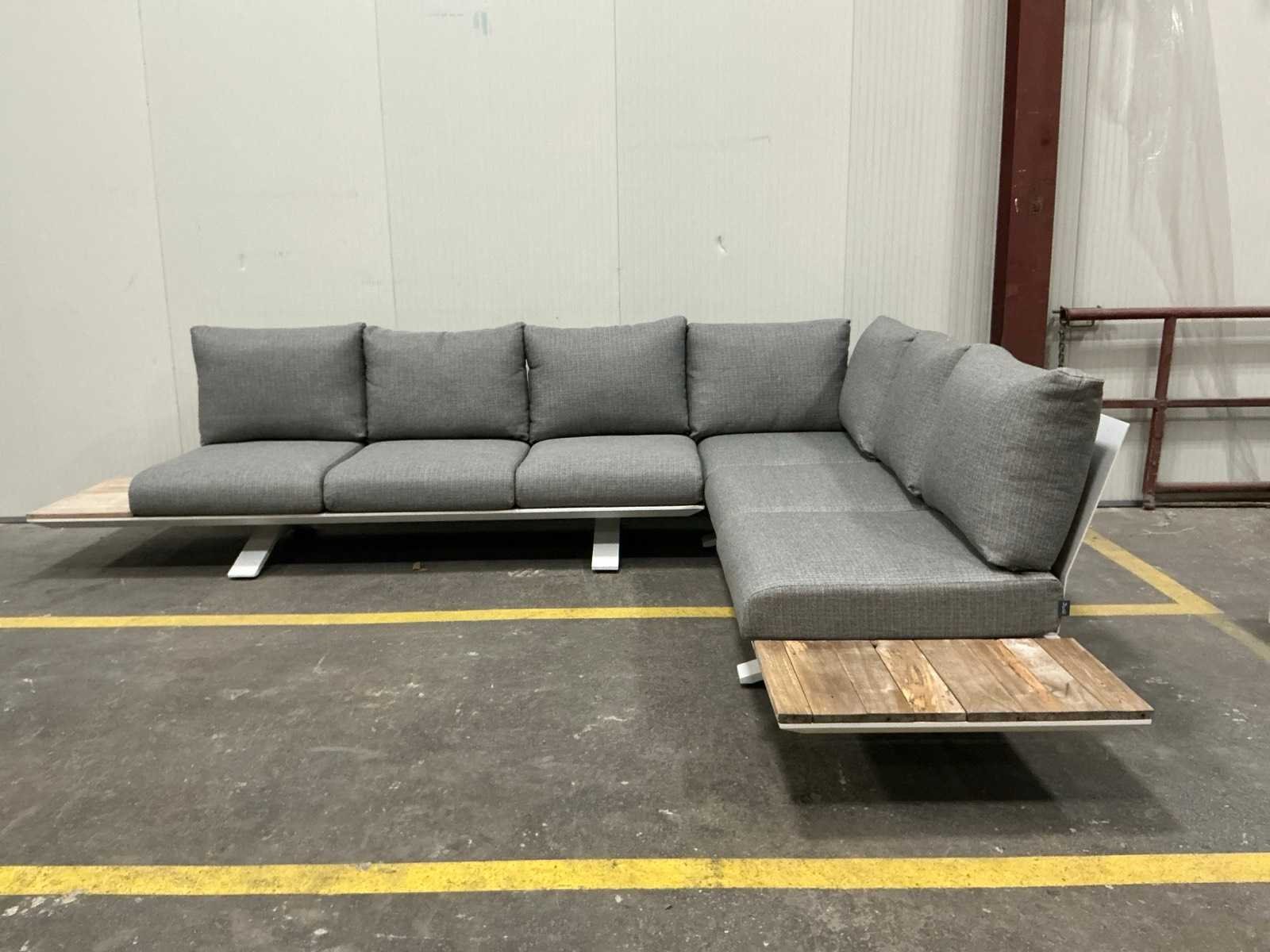 Hoekopstelling 340x260cm; tafel 75x75x27cm; kussens zijn ongebruikt en sunproof Kussens: true Tafel: Ja Kleur: Wit Zithoogte: 27 Materiaal: Aluminium met hout