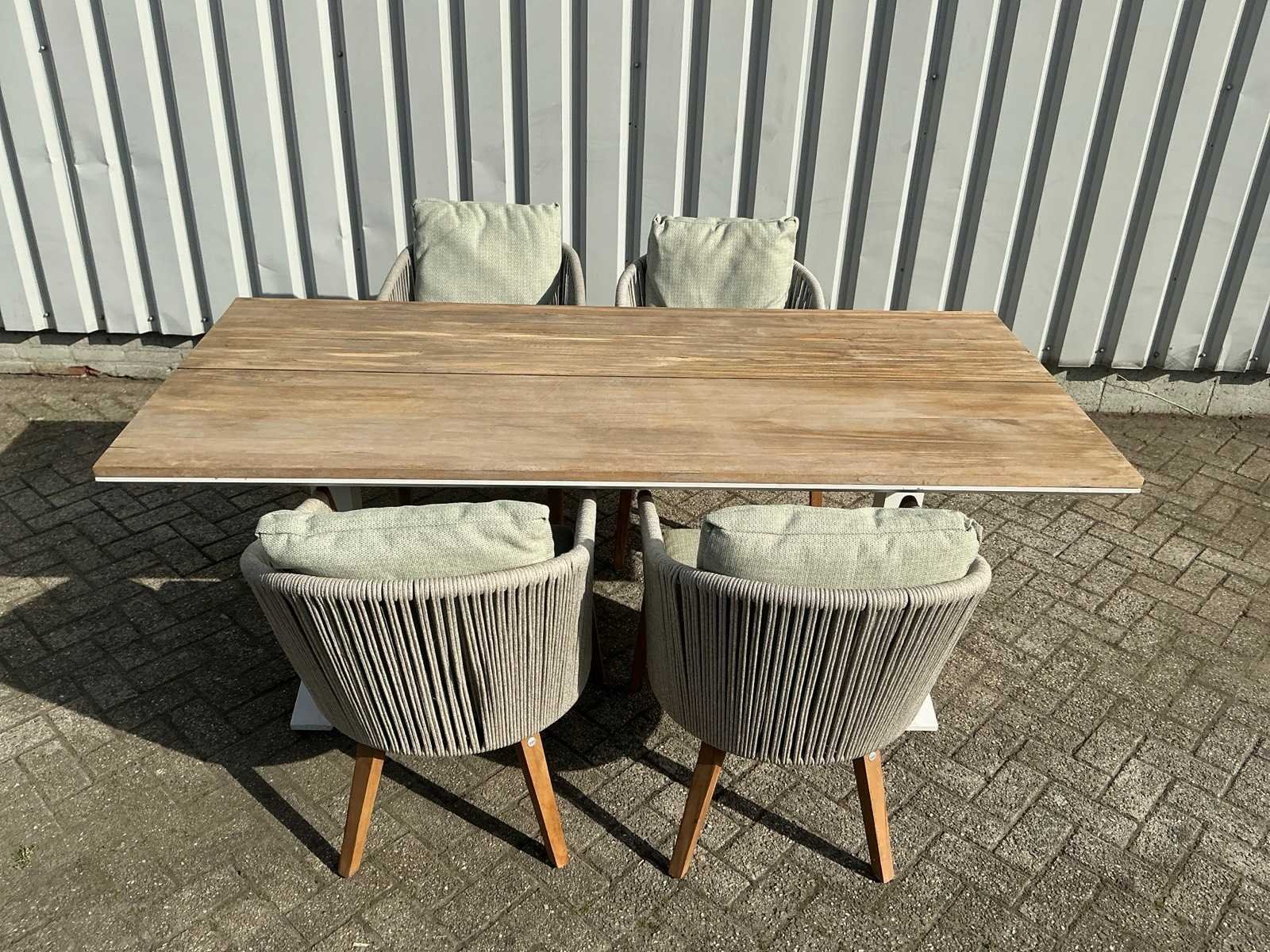 Betreft 1 tuintafel met 4 stoelen ( let op stoelen beschadigd zie afbeeldingen ) 1 van de 4 stoelen heeft een andere vorm/kleur Kleur: Mat white/teak Lengte: 220cm Breedte: 100cm Hoogte: 75cm