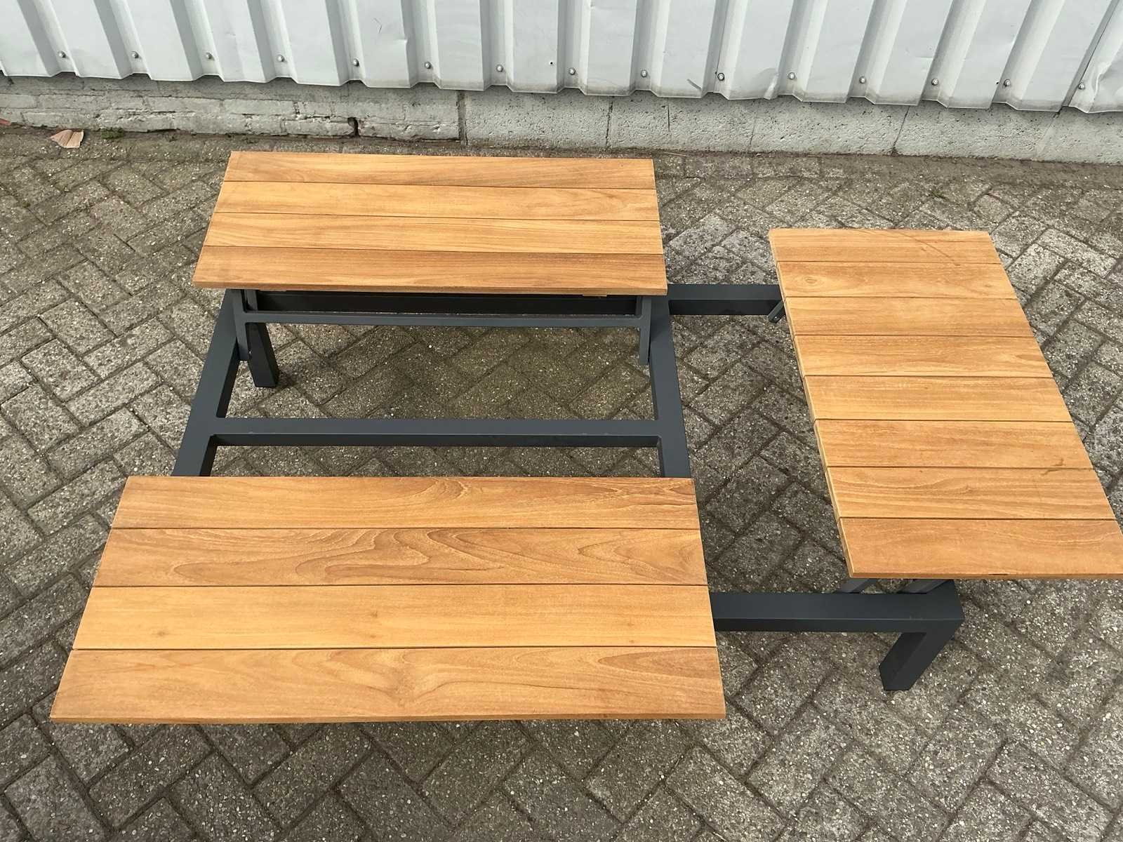 Product beschadigd zie afbeeldingen Merk: Suns Kleur: Matt Royal grey/teak Lengte: 140cm Breedte: 82cm Hoogte: 35cm Materiaal: Aluminium/hout