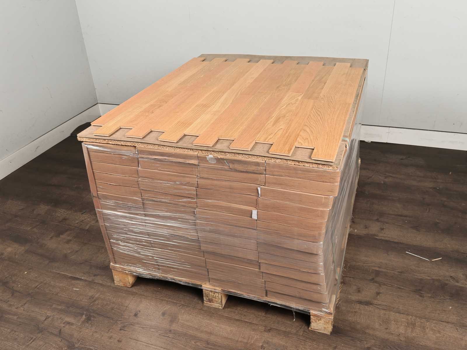 Kwaliteits parketvloer, vloer is van hoogwaardig Europees eiken hout, dikte 9,3 mm, 29 pakken a 2,72 m2, dient verlijmd te worden Merk: Weitzer Product type: Parket Oppervlakte: 78m² Geschikt voor vloerverwarming: Ja V-groef: Nee Afwerking: Gelakt, vlak afgewerkt Aantal m² per verpakking: 2.72m² Kleur: Eiken 64156 Gewicht: 650kg Lengte: 500mm Breedte: 68mm Materiaal: Eiken multiplank