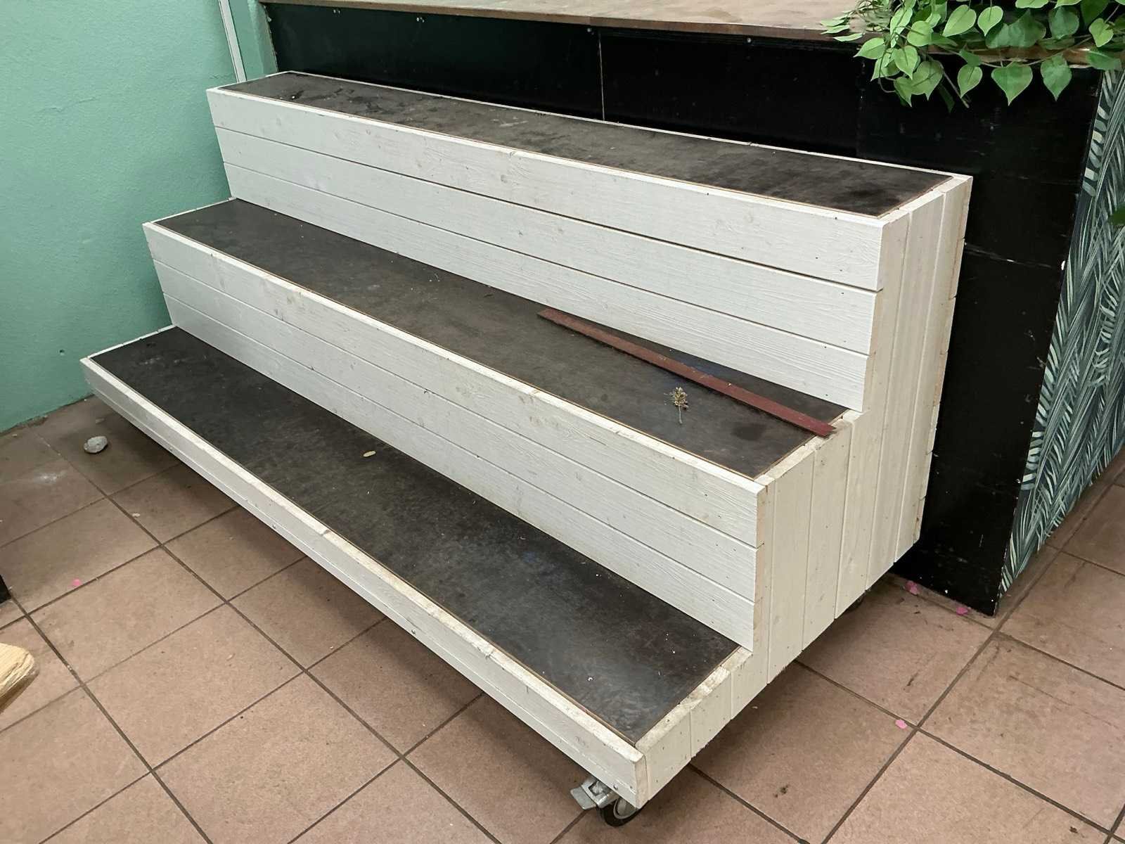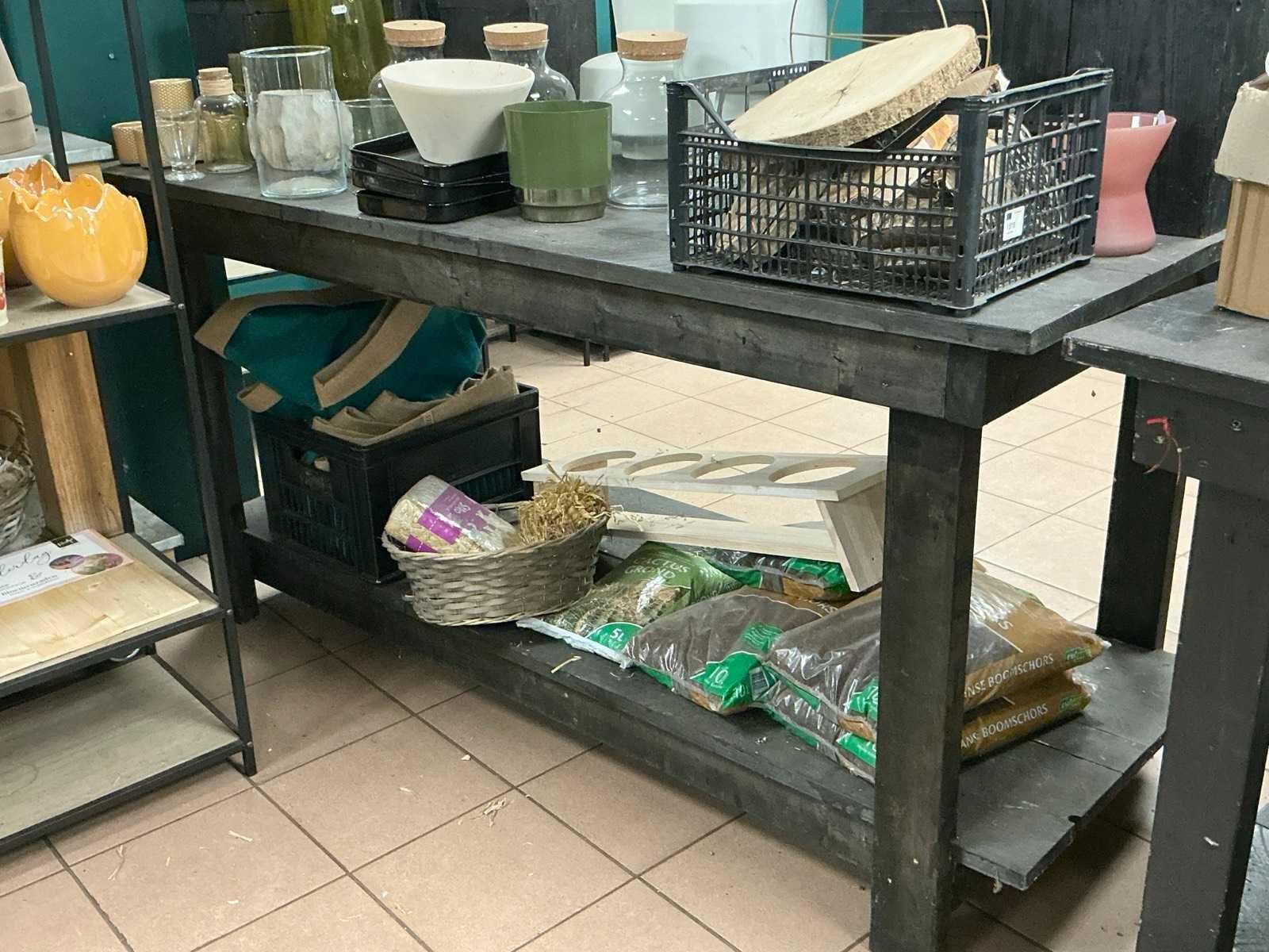 Bestaande uit, 6x houten tafels, 3x plantendisplay, circa 10 veilingkisten