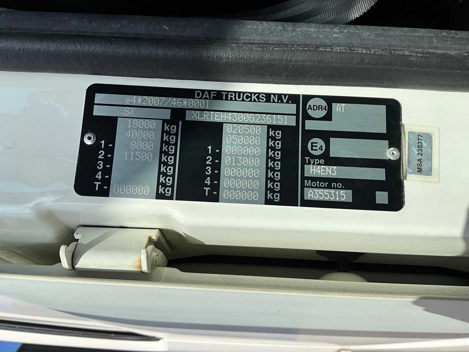 Kenteken: 70-BTK-1 Merk: DAF Type: XF 480FT Bouwjaar: 2018 Chassisnummer VIN: XLRTEH4300G236151 Cilinderinhoud: 12902cc Kilometerstand bij opname: 580916km APK vervaldatum: 2026-10-05 Datum eerste toelating: 2018-12-14 Type transmissie: Automatisch Aantal assen: 2 Asconfiguratie: 4x2 Fuel Type: Diesel Emissieklasse: 6 Slaapcabine: true Navigatie: true Nationaliteit documenten: Nederlands Kentekenpapieren compleet?: true Aantal zitplaatsen: 2 Automaat: true Diesel: true