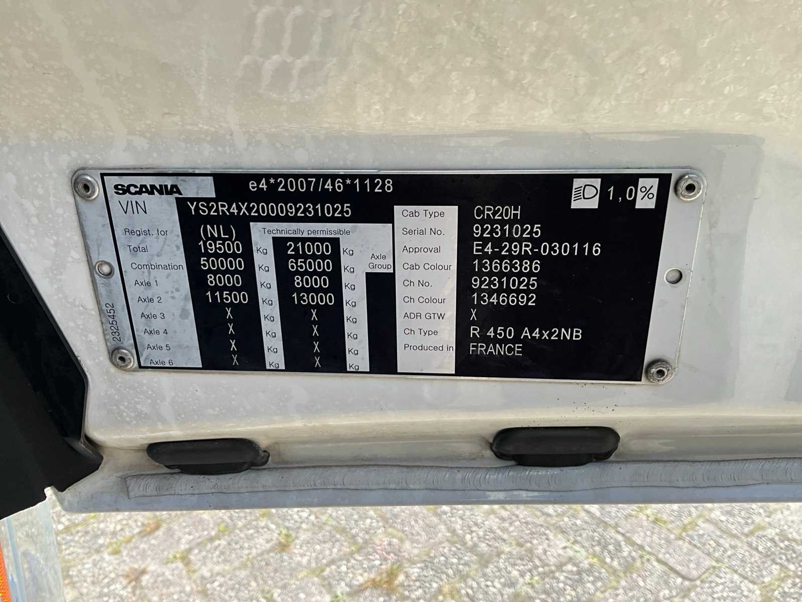 Kenteken: 11-BKF-5 Merk: Scania Type: R450 Bouwjaar: 2017 Chassisnummer VIN: YS2R4X20009231025 Cilinderinhoud: 12742cc Kilometerstand bij opname: 1033700km APK vervaldatum: 2026-09-15 Datum eerste toelating: 2017-11-29 Type transmissie: Automatisch Aantal assen: 2 Asconfiguratie: 4x2 Fuel Type: Diesel Emissieklasse: 6 Slaapcabine: true Navigatie: true Nationaliteit documenten: Nederlands Aantal zitplaatsen: 2 Automaat: true Diesel: true