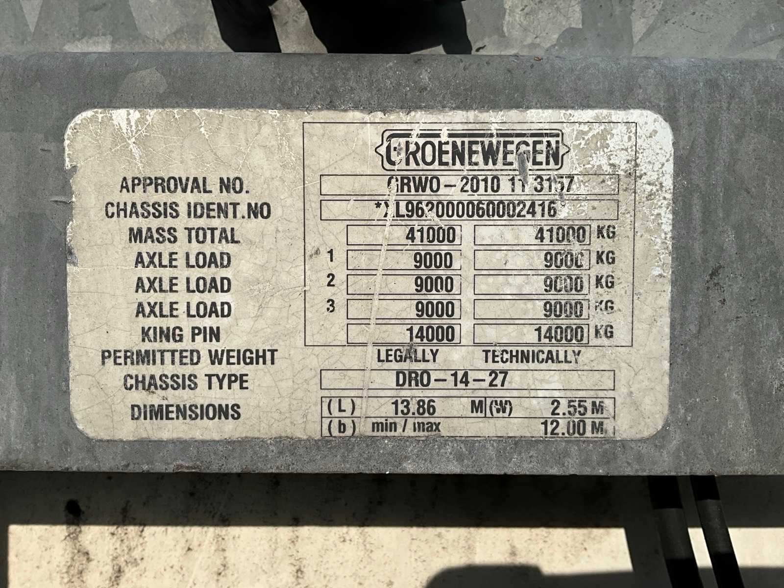 Merk: Groenewegen Type: DRO-14-27 Type aanhangwagencarrosserie: Gesloten aanhangwagen Bouwjaar: 2006 Chassisnummer VIN: XL962000060002416 Kenteken: OJ-16-JV Datum eerste toelating (NL): 2006 Datum eerste toelating: 2006-10-16 Aantal assen: 3 Hydraulische laadklep: true