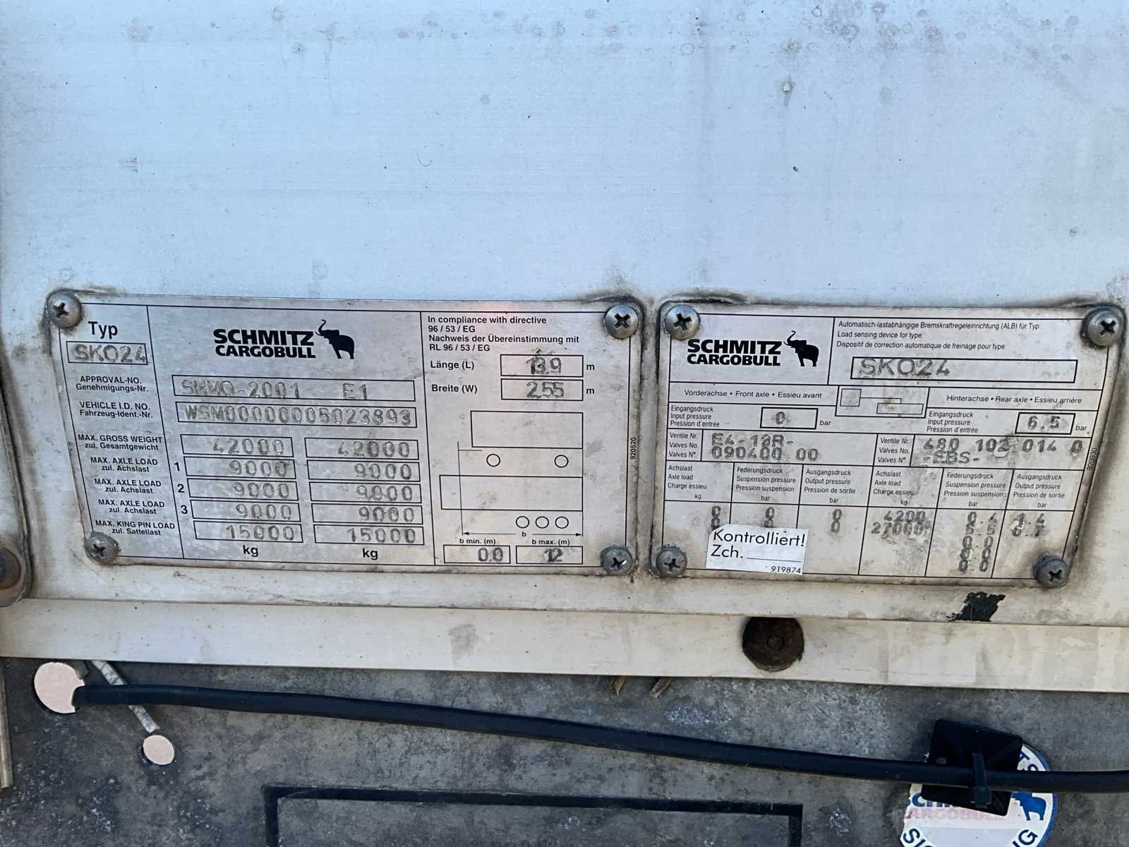 Merk: Schmitz Type: SKO 24 Type aanhangwagencarrosserie: Gesloten aanhangwagen Bouwjaar: 2007 Chassisnummer VIN: WSM000000005023893 Kenteken: OJ-18-RF Datum eerste toelating (NL): 2007 Datum eerste toelating: 2007-02-14 Aantal assen: 3