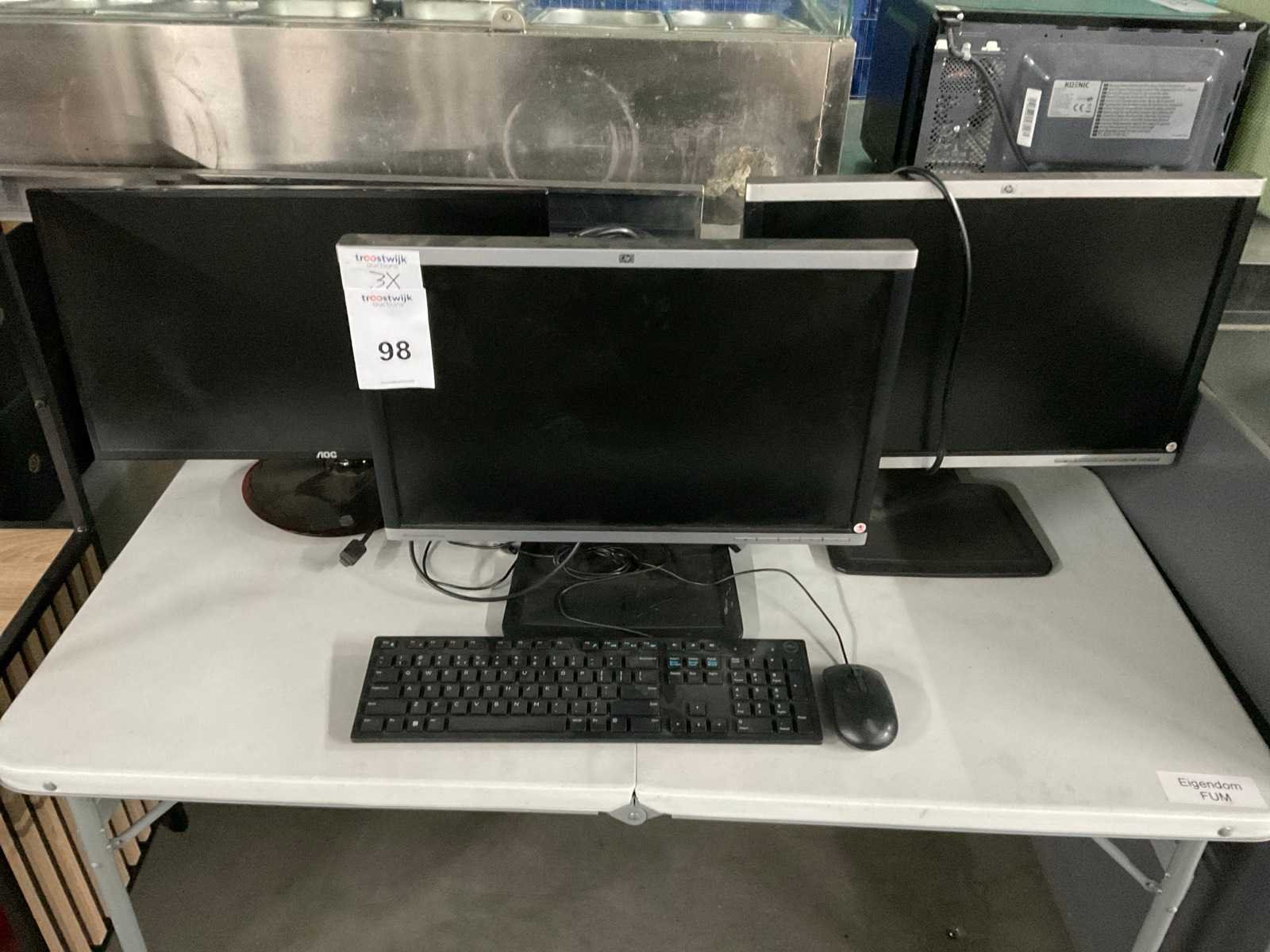 3 diverse monitoren w.o. Hp en aoc inclusief toetsenbord en muis, zonder tafel