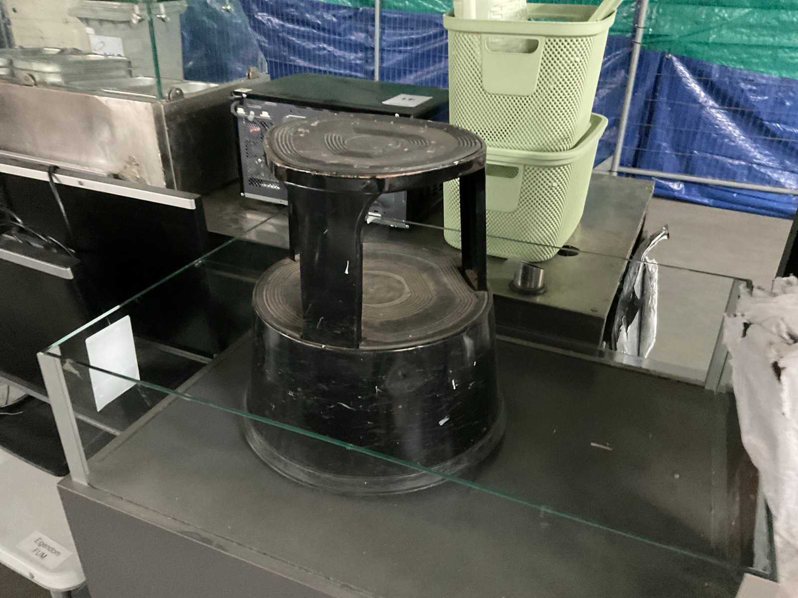 Bestaande uit verrijdbare display, ca. 80x60x102 cm, olifantpoot, kast op metalen poten, ca. 60x40x122 cm, inclusief diverse glazen vazen en metalen vierkante emmers.