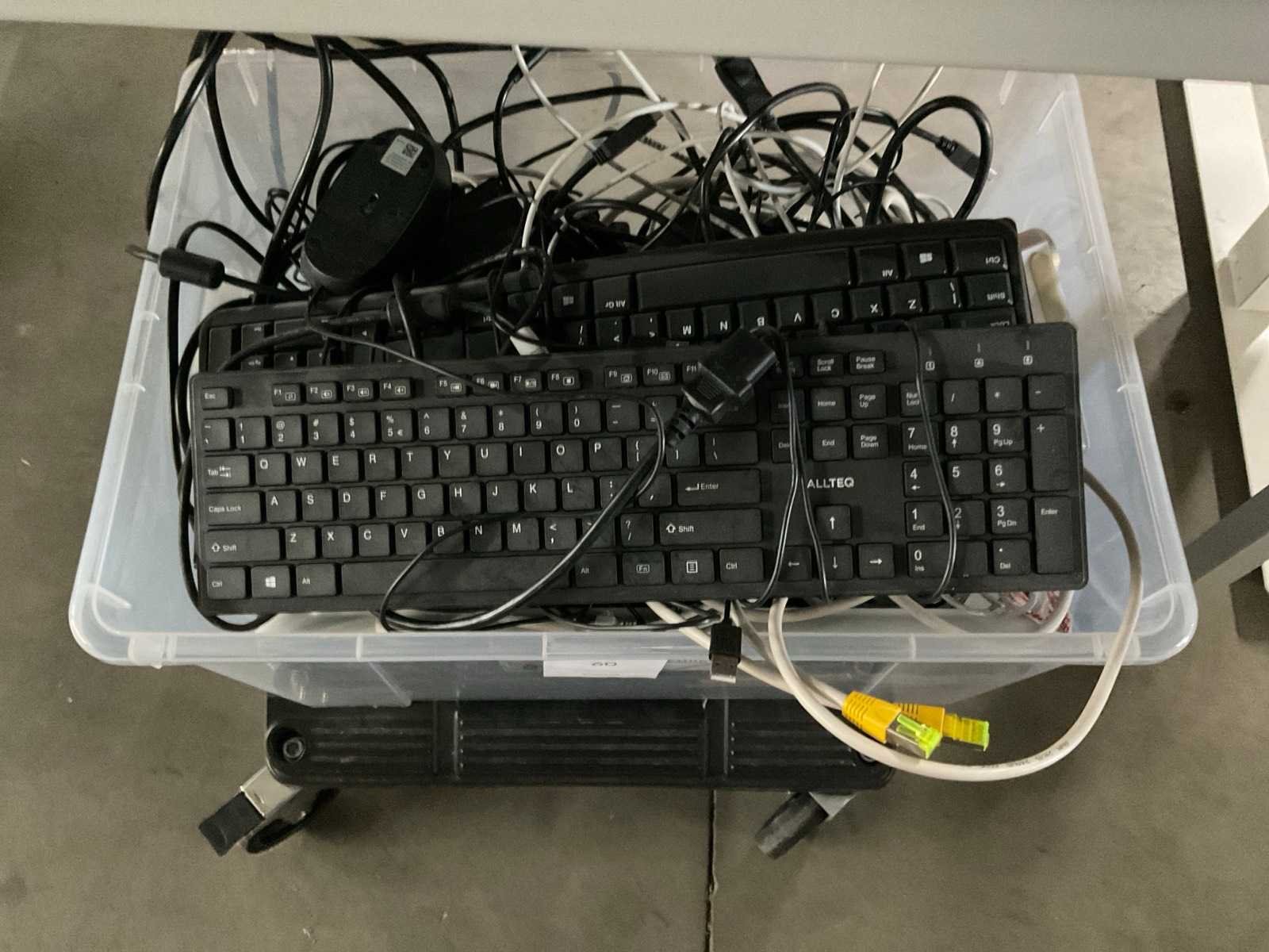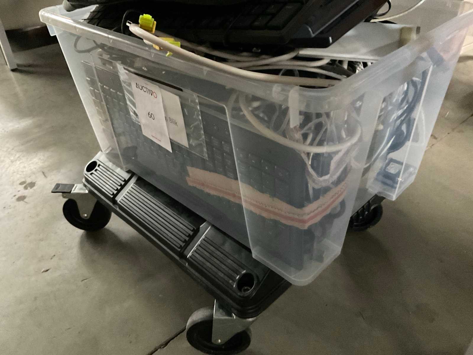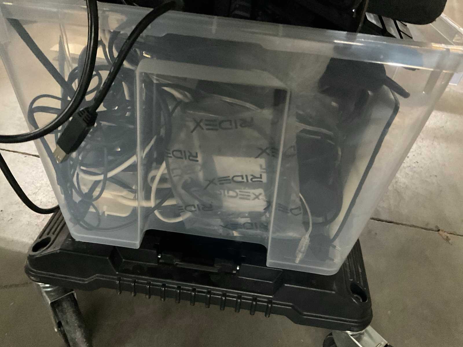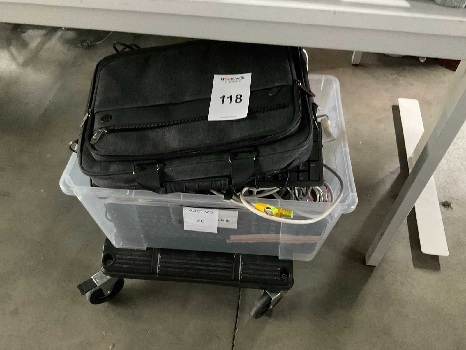 Diverse kabels in krat inclusief laptoptas en dolly.