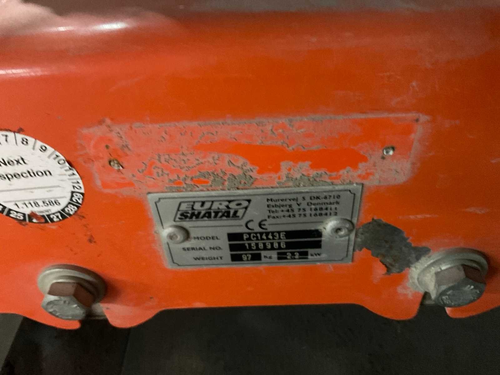 Merk: Eurosnatal Type: PC1443E Bedrijfsgewicht: 97kg Grondplaat afm. l: 550mm Grondplaat afm. b: 400mm Motorvermogen (kW): 2.2kW Totale afmeting L: 800mm Totale afmeting Breedte: 500mm Totale afmeting Hoogte: 930mm