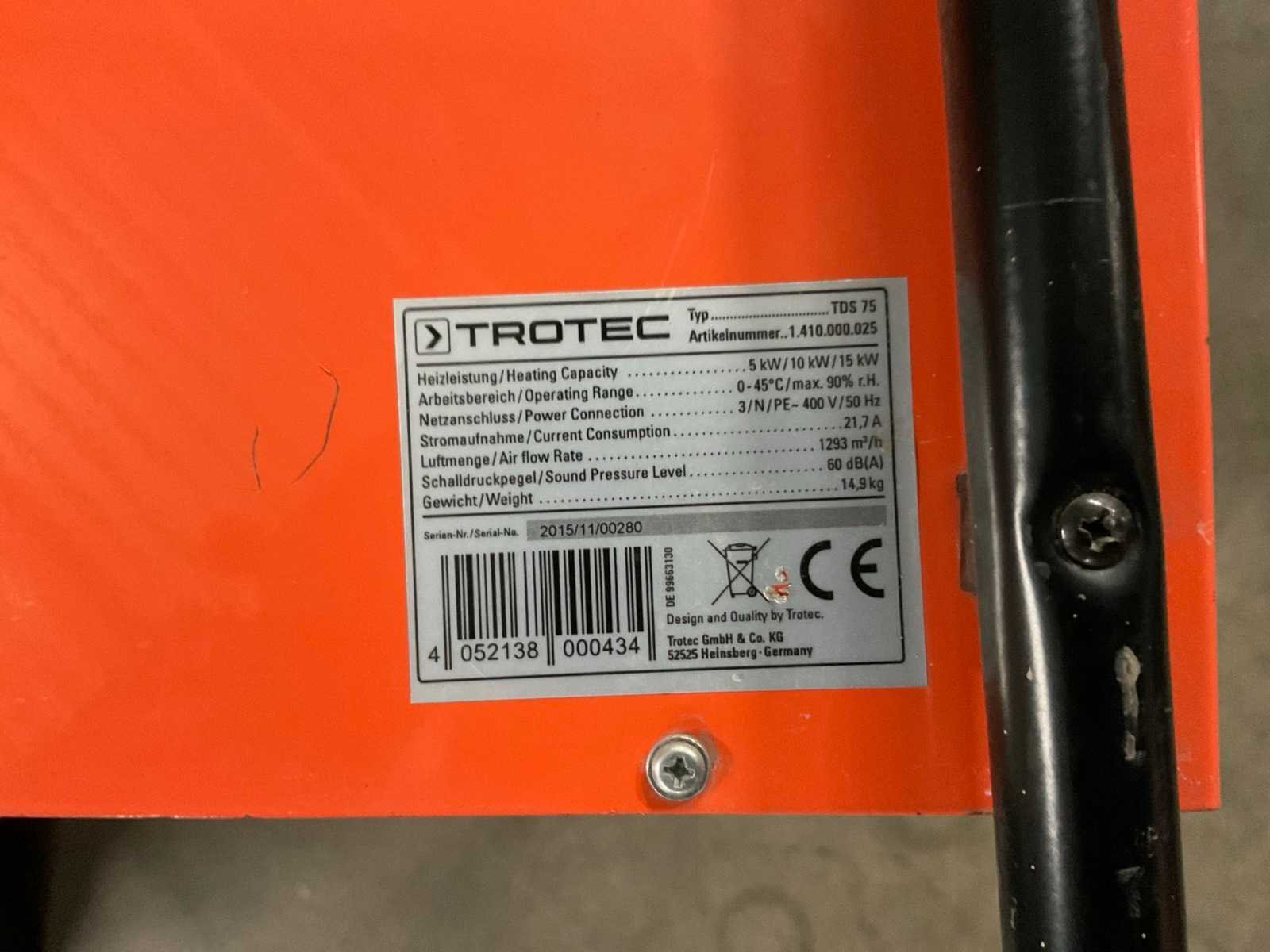 Merk: Trotec Type: TDS 75 Vermogen: 15kW Ventilator: true Thermostaat: true Eigen gewicht: 15kg Totale afmeting L: 400mm Totale afmeting Breedte: 330mm Totale afmeting Hoogte: 530mm Aansluiting: 380V