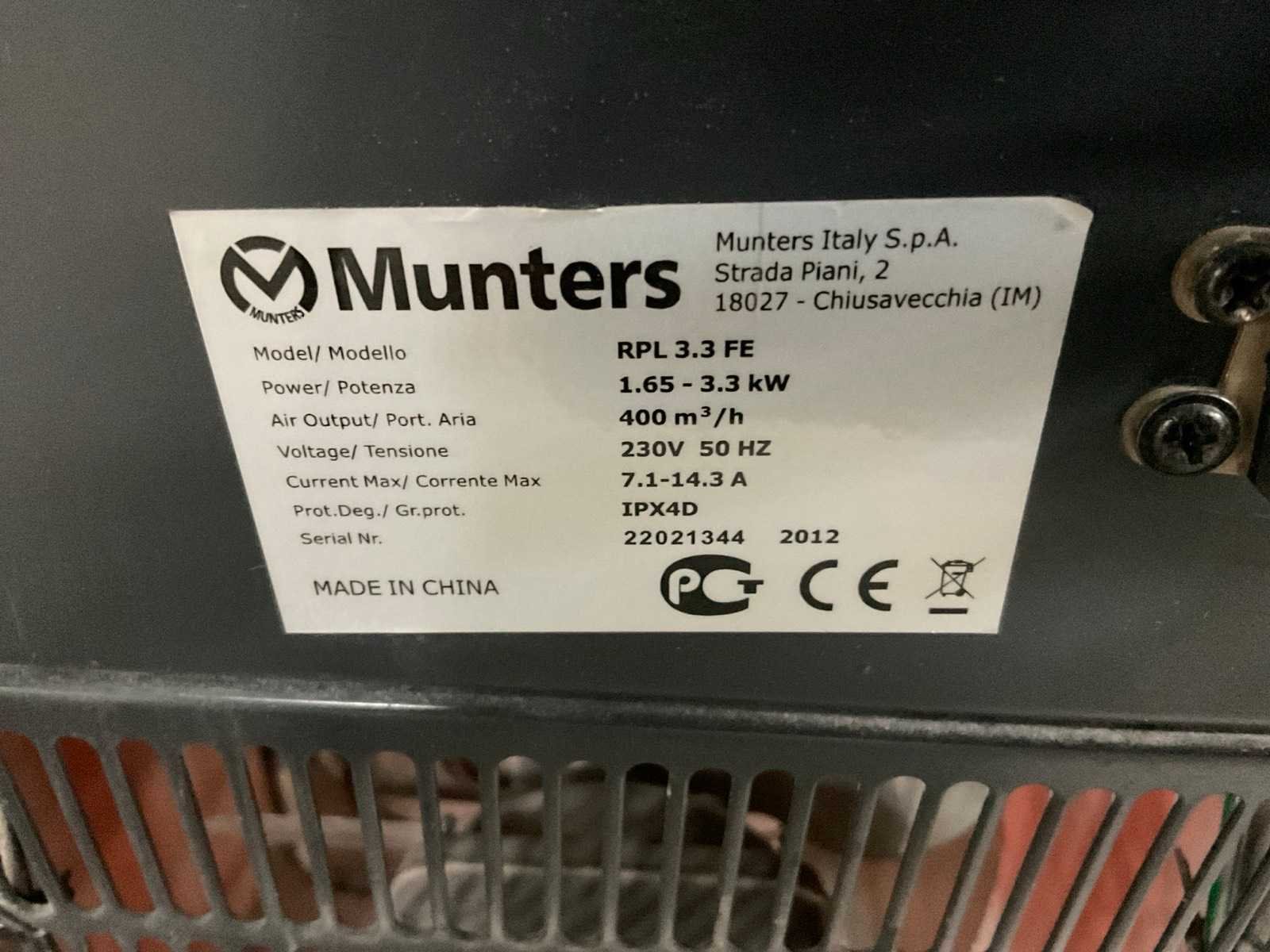 Merk: Munters Type: RPL 3.3 FE Bouwjaar: 2012 Vermogen: 3.3kW Ventilator: true Thermostaat: true Totale afmeting L: 250mm Totale afmeting Breedte: 260mm Totale afmeting Hoogte: 360mm Aansluiting: 230V