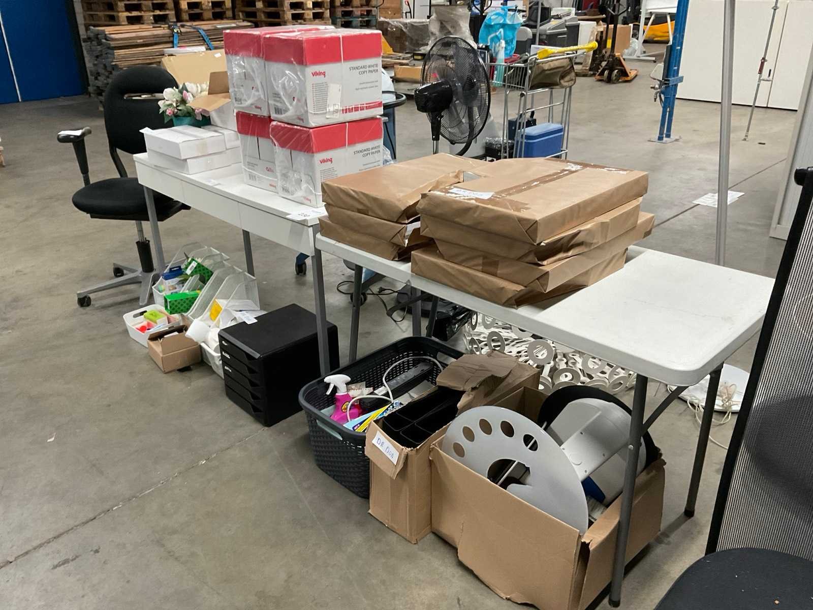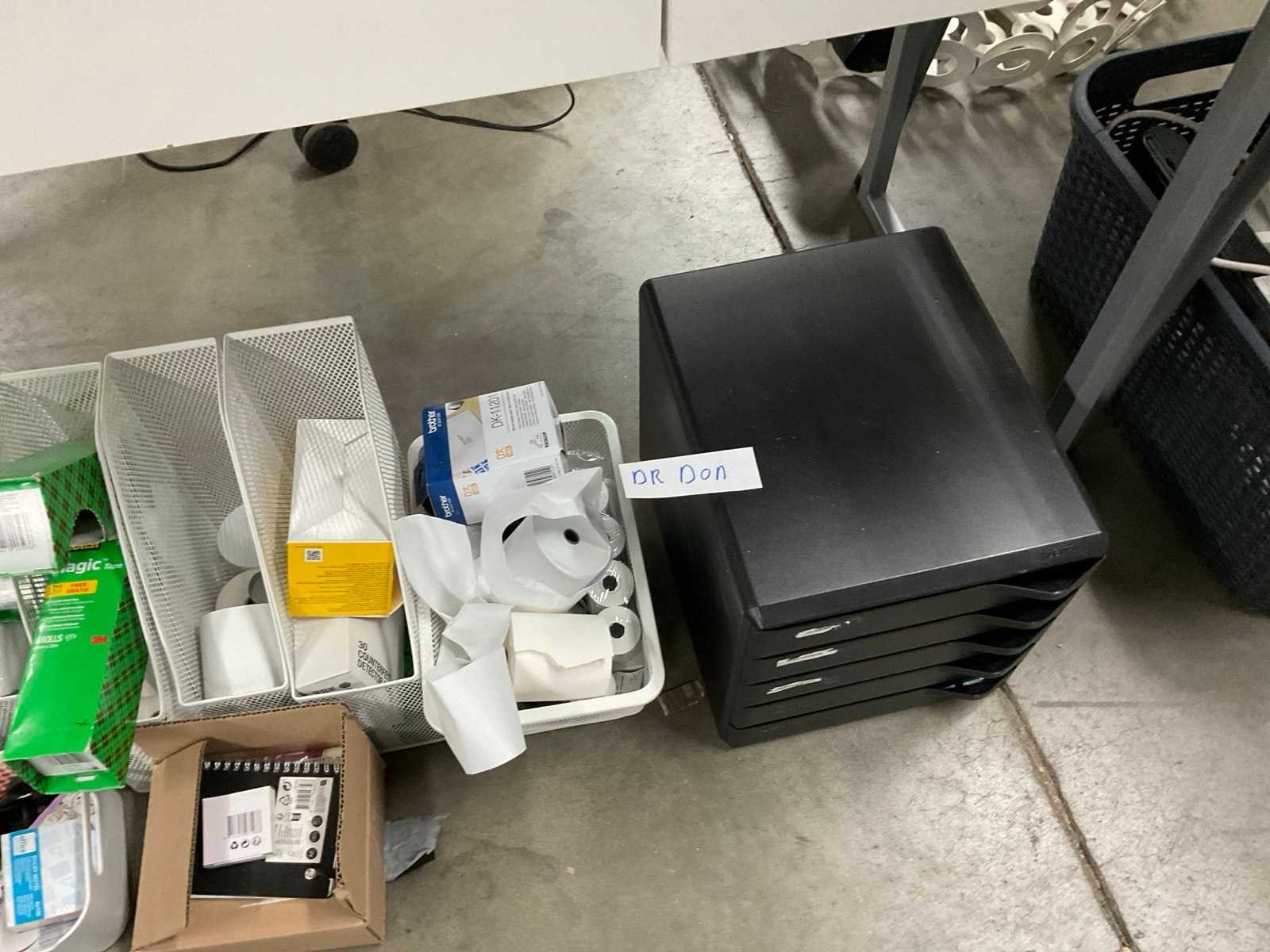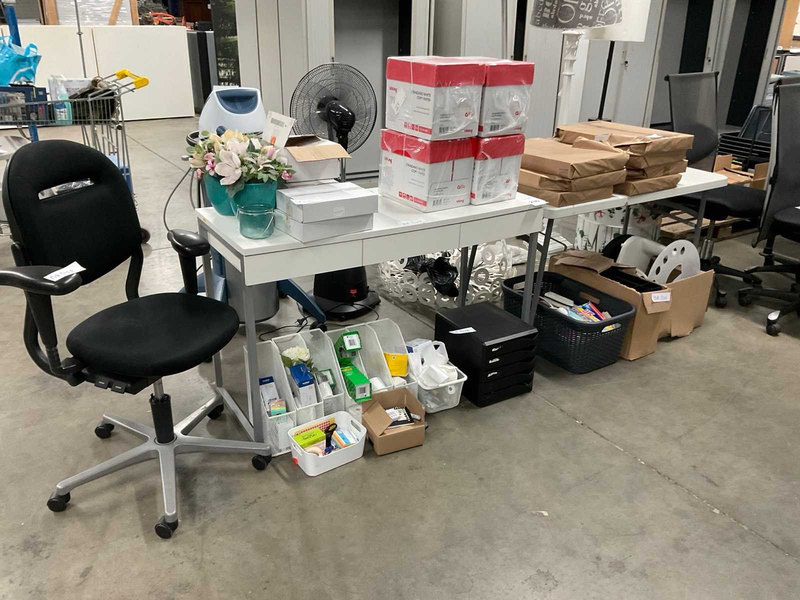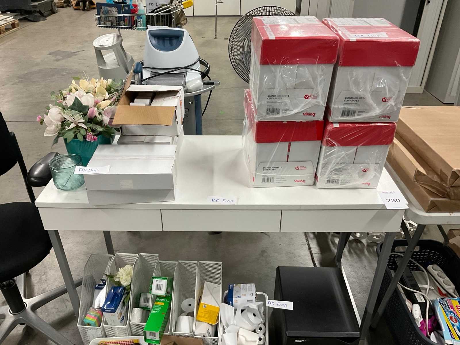 Diverse kantoorartikelen inclusief tafeltje met lade, bureaustoel en A4 papier.