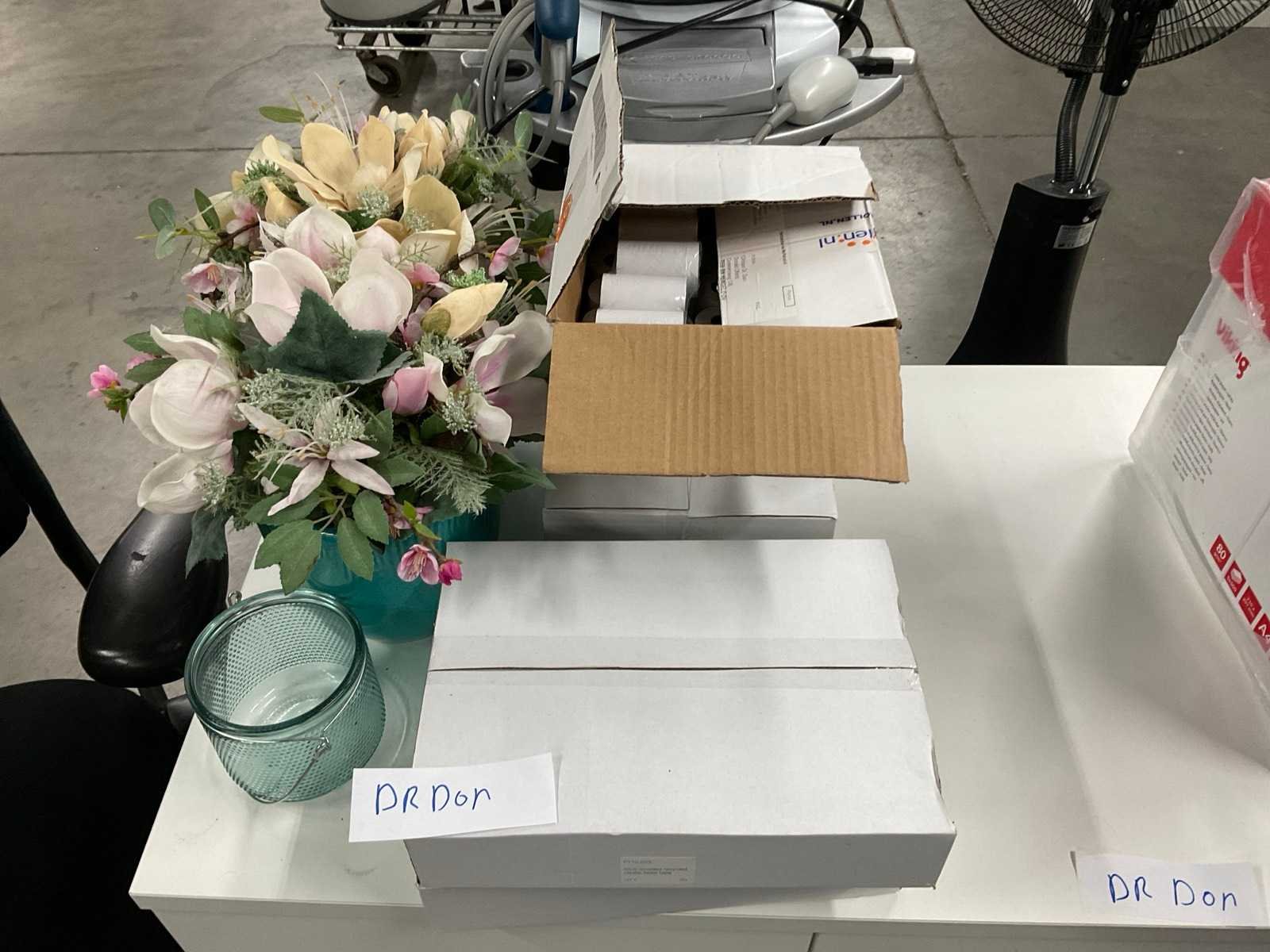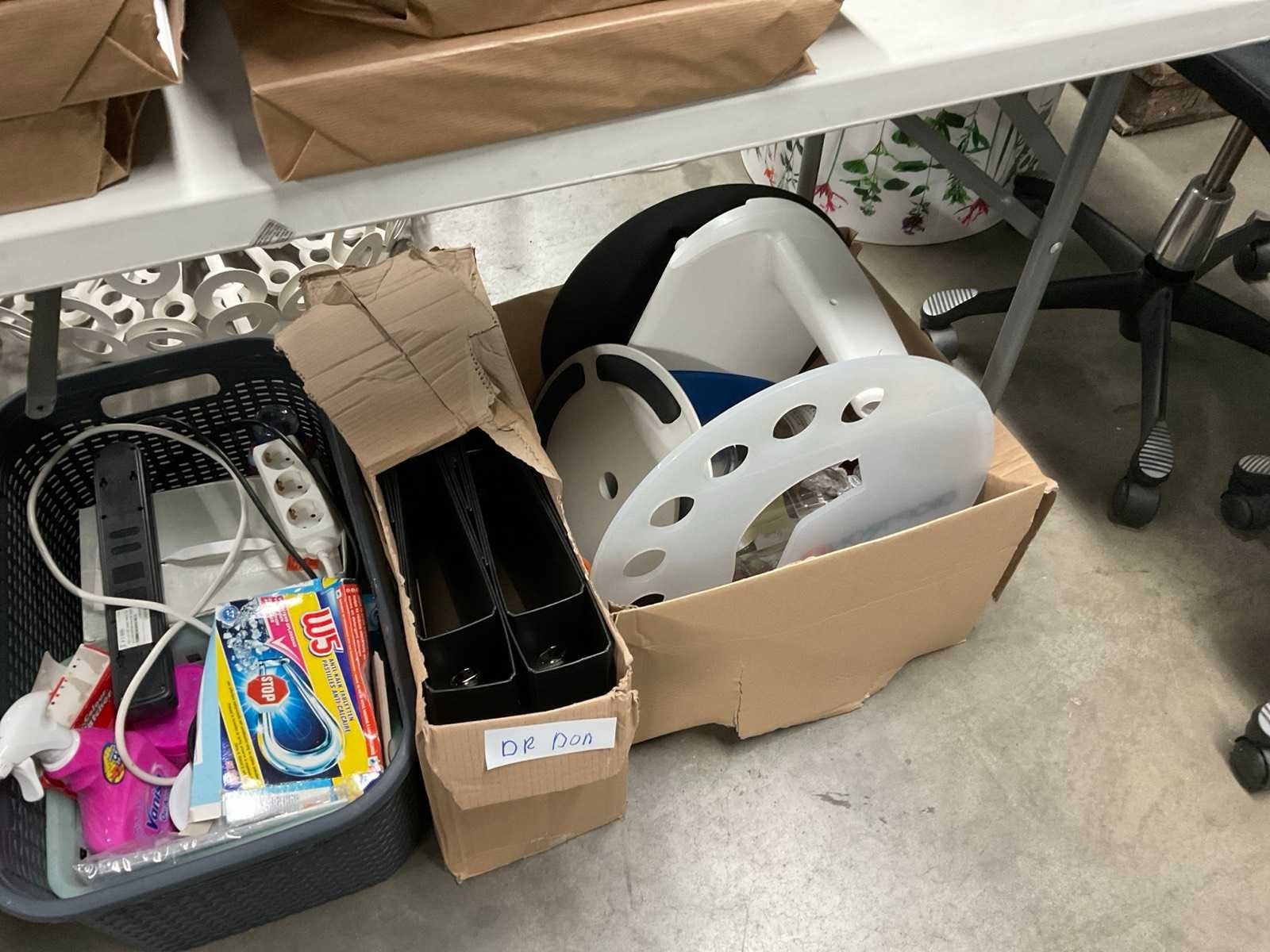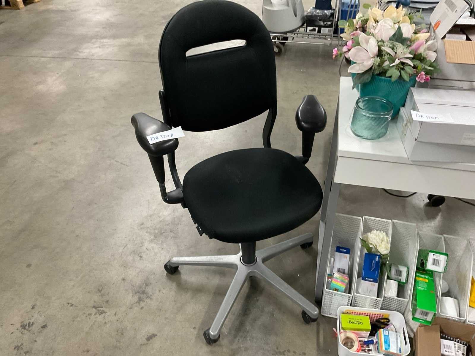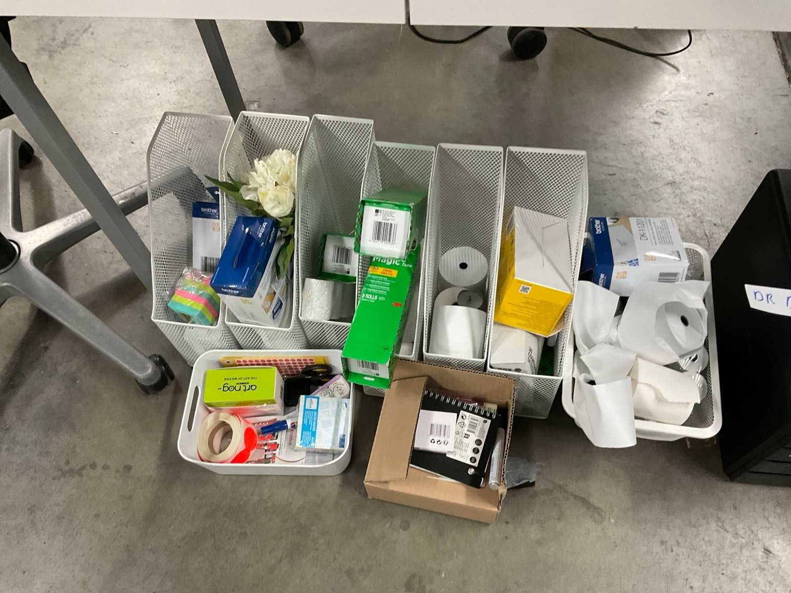 Diverse kantoorartikelen inclusief tafeltje met lade, bureaustoel en A4 papier.