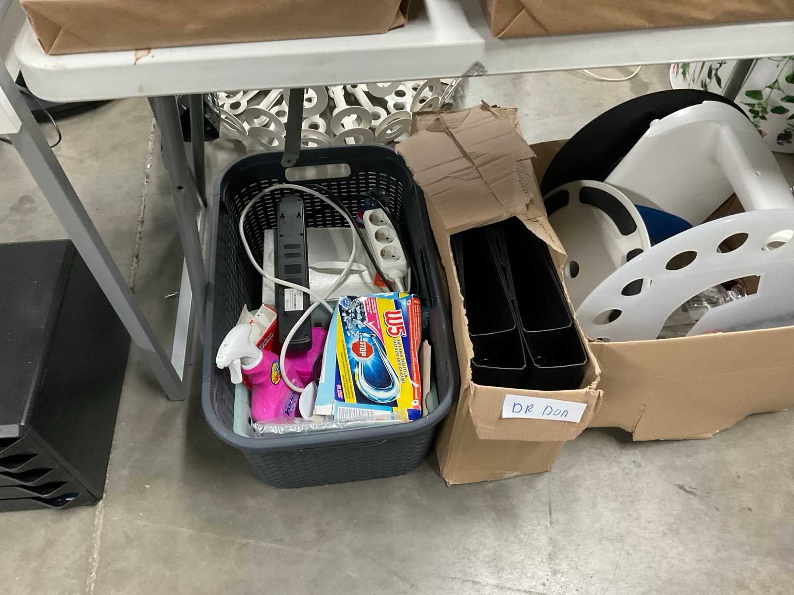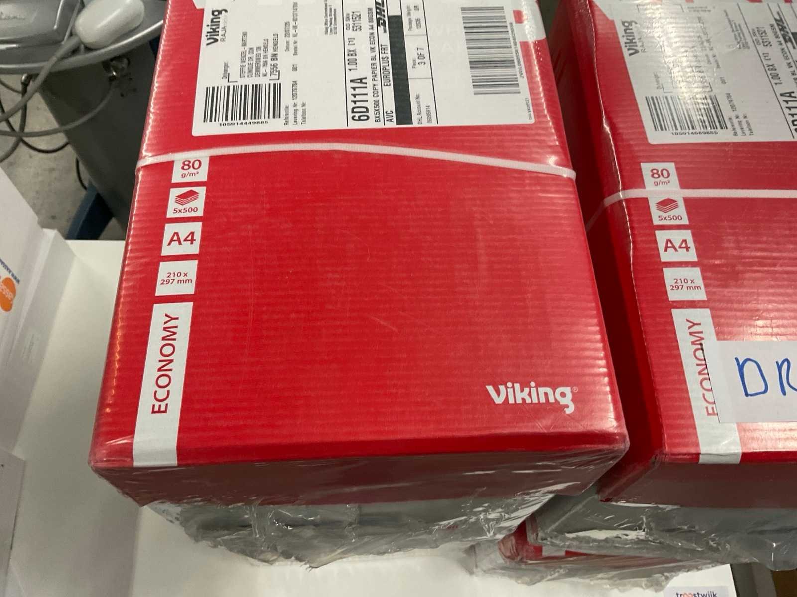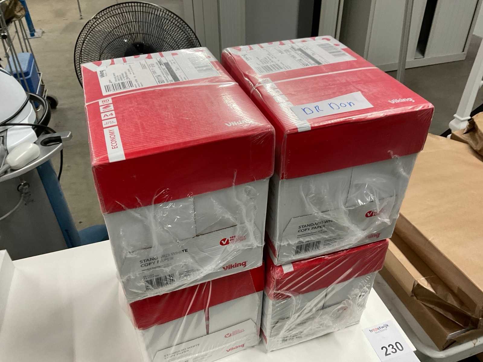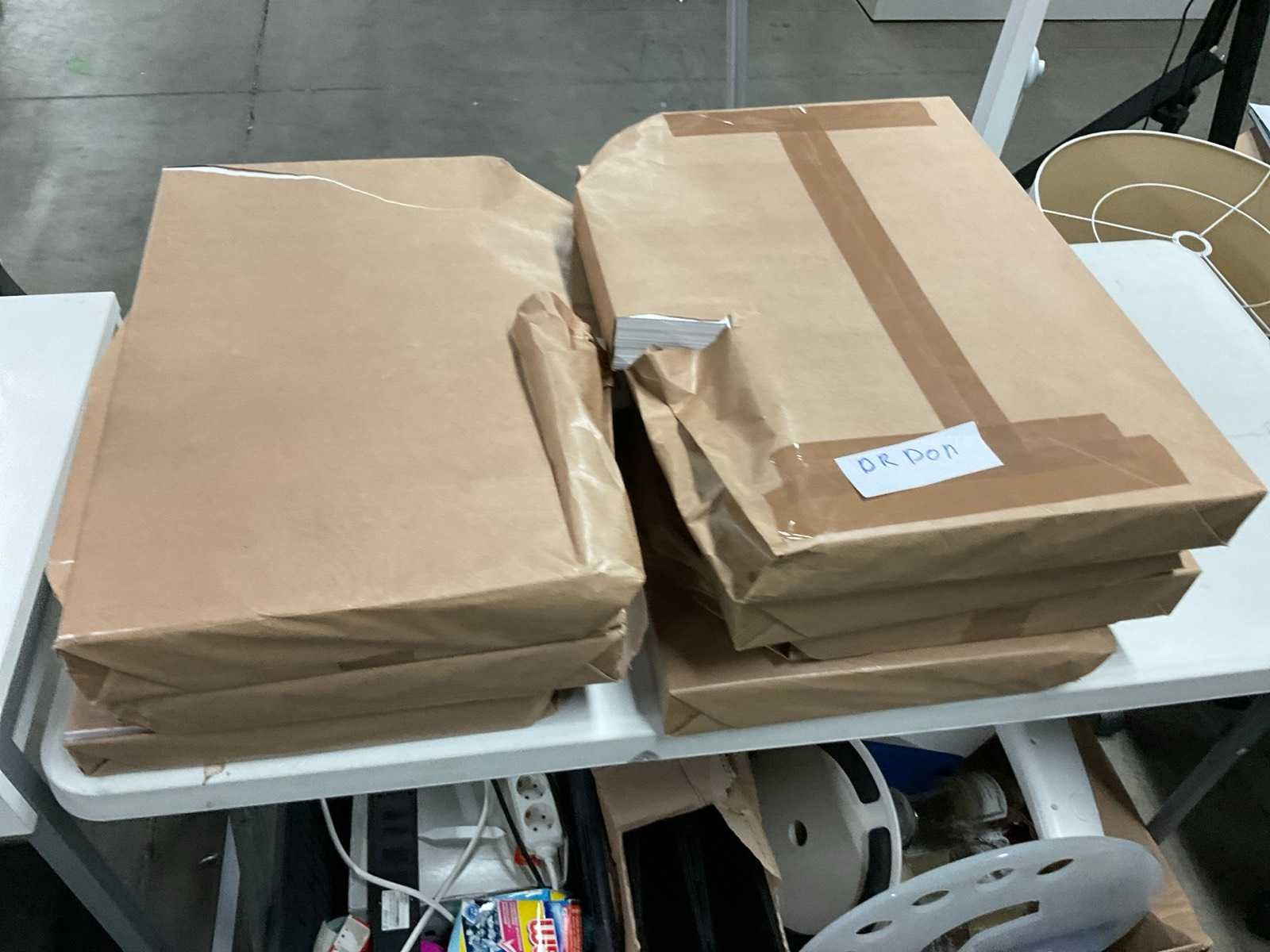 Diverse kantoorartikelen inclusief tafeltje met lade, bureaustoel en A4 papier.