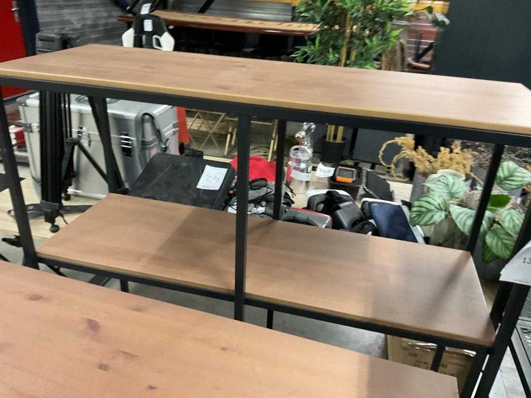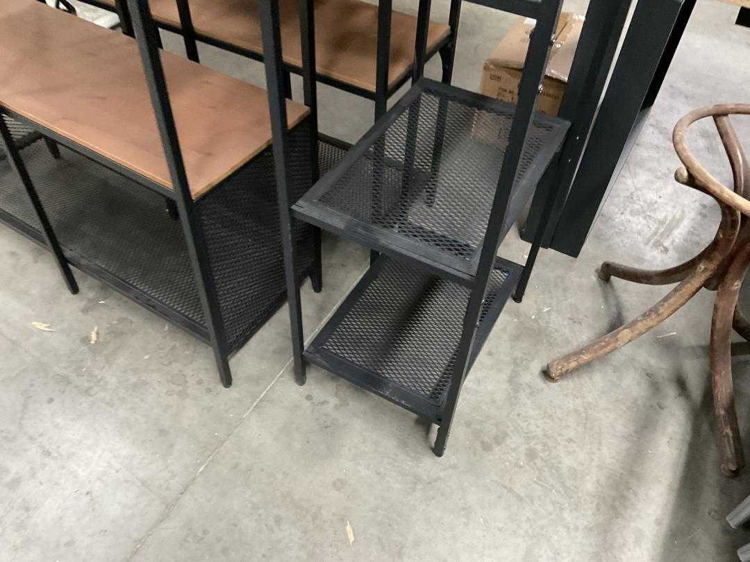 Drie stellingkasten met metalen frame en houten legplanken, in drie afmetingen: ca. 100x36x136 cm, ca. 100x36x95 cm en ca. 51x36x136 cm. Specificaties Aantal: 3 stuks Afmetingen (lxbxh, ca.): 1x 100x36x136 cm 1x 100x36x95 cm 1x 51x36x136 cm Constructie: metalen frame Legplanken: combinatie van houten legplanken en metalen gaaslegplanken