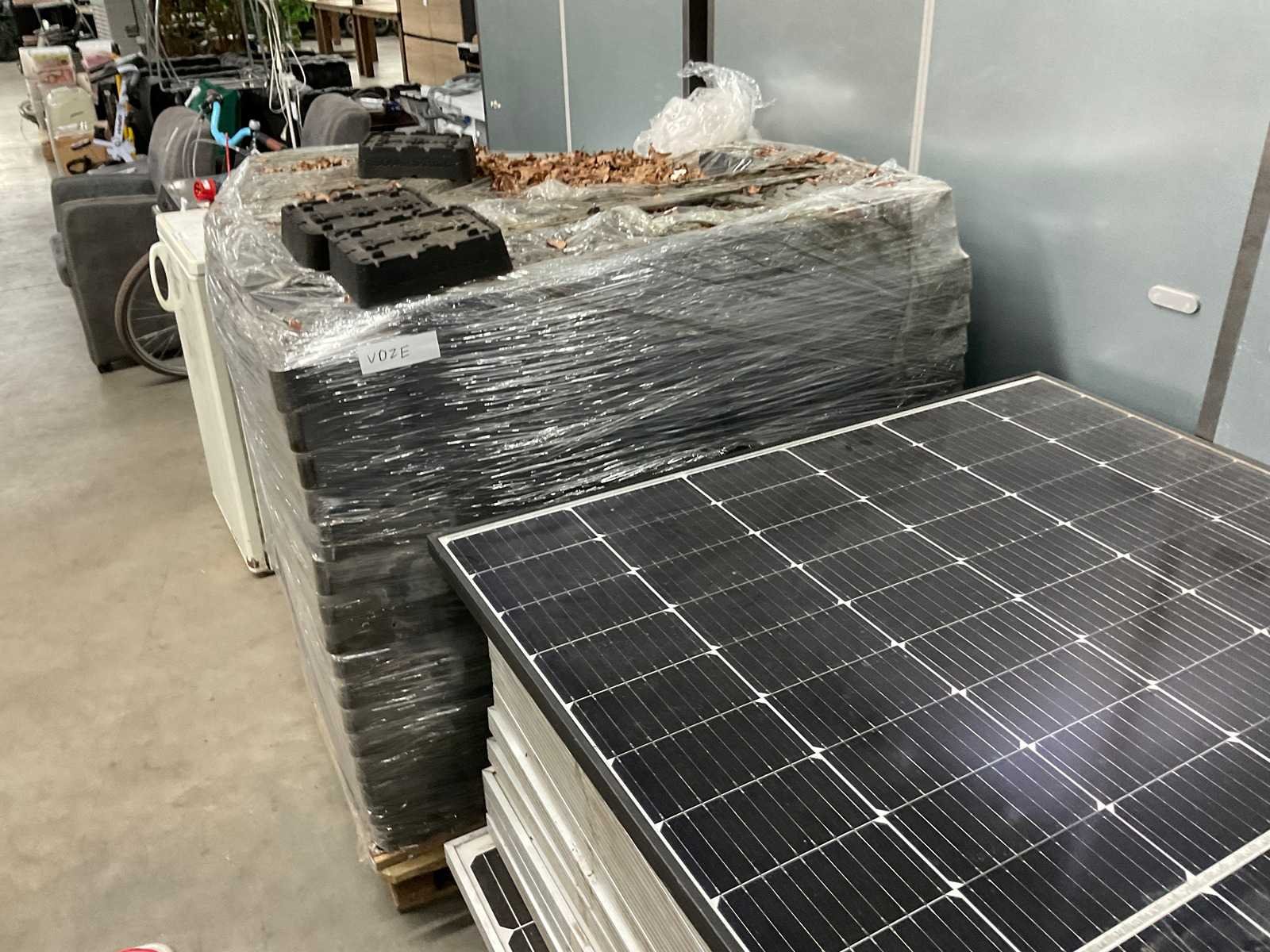 Partij diverse zonnepanelen inclusief pallet met rubber voeten t.b.v. zonnepanelen constructie