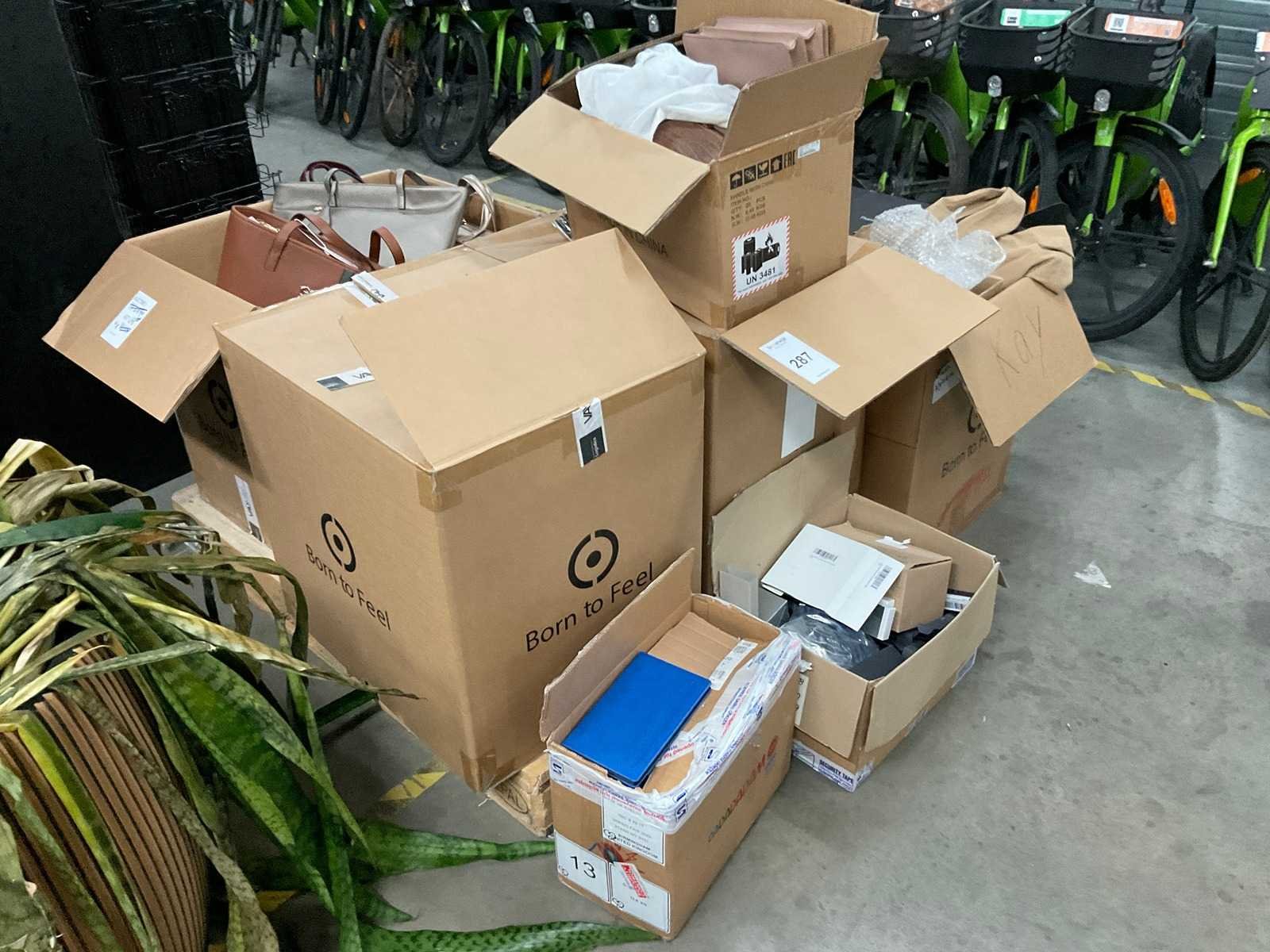 3 dozen met handtassen in diverse uitvoeren en maten inclusief diverse andere goederen w.o. schrijfblokken met zwart papier