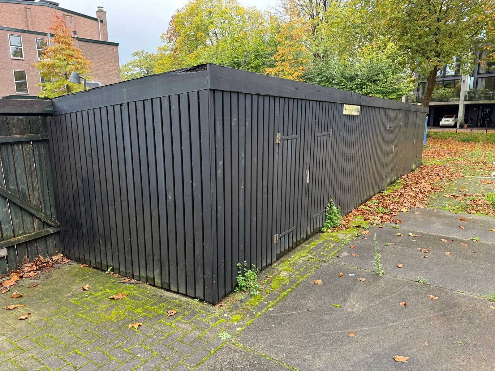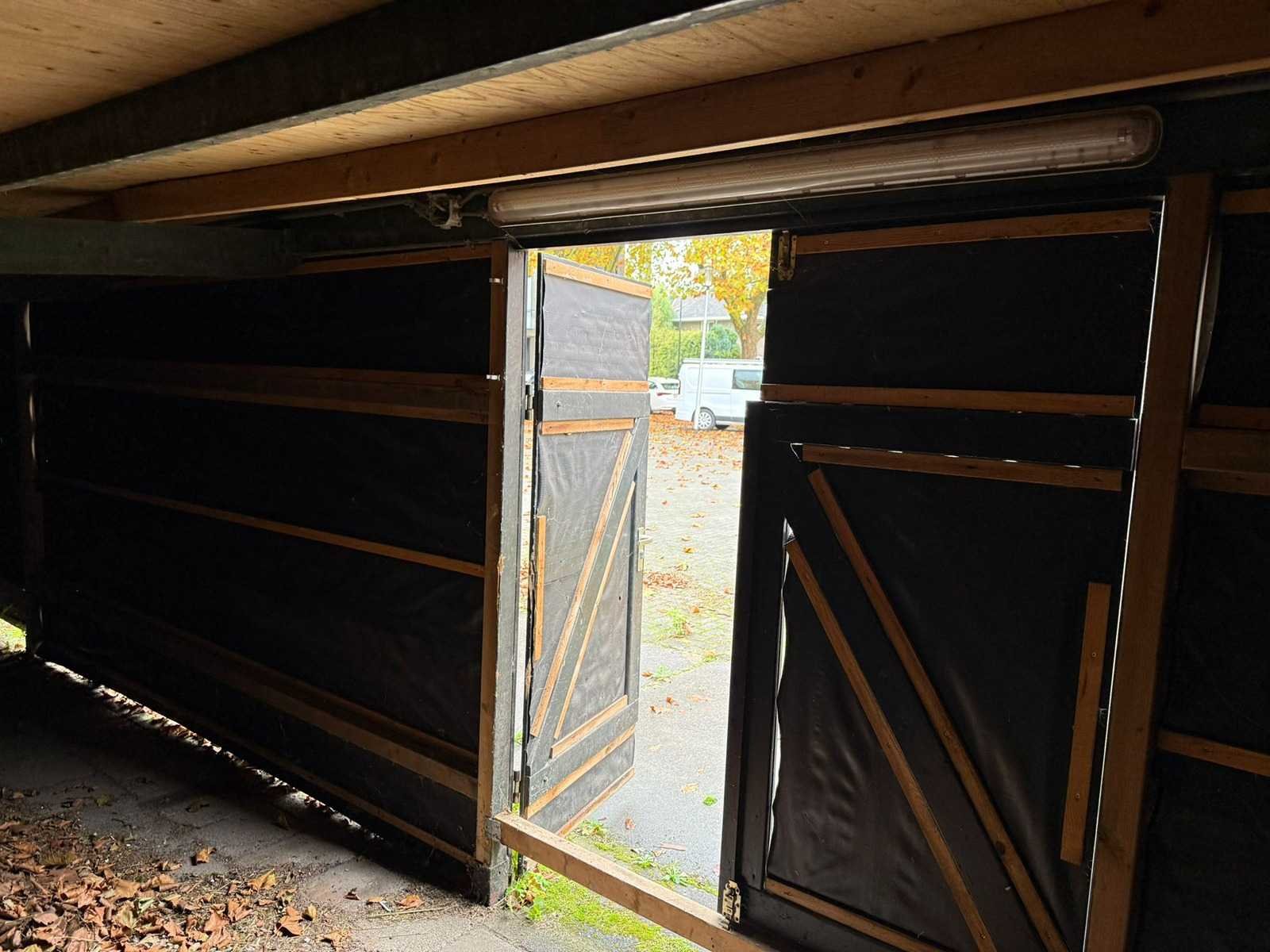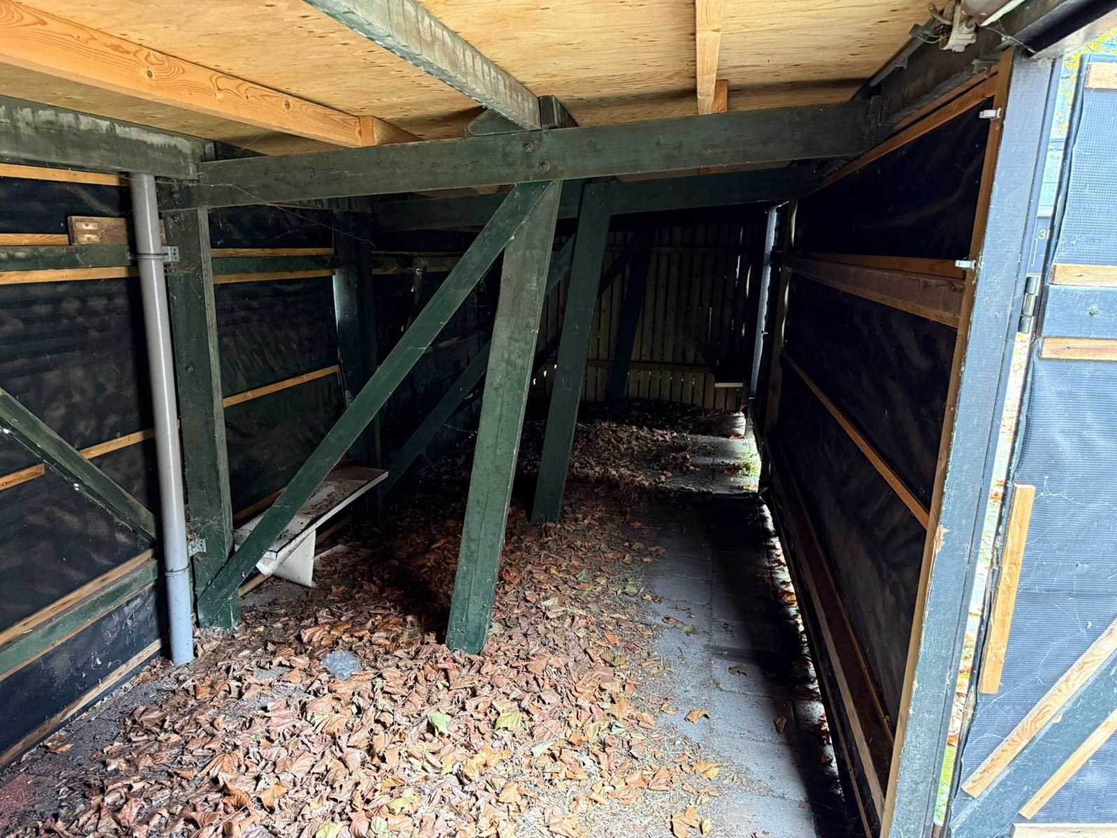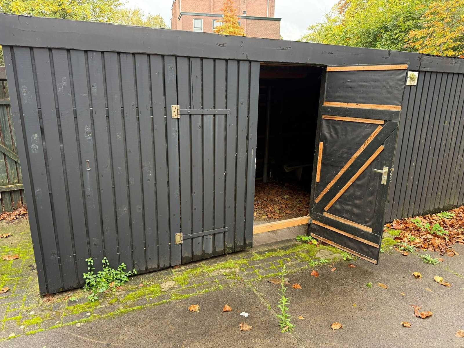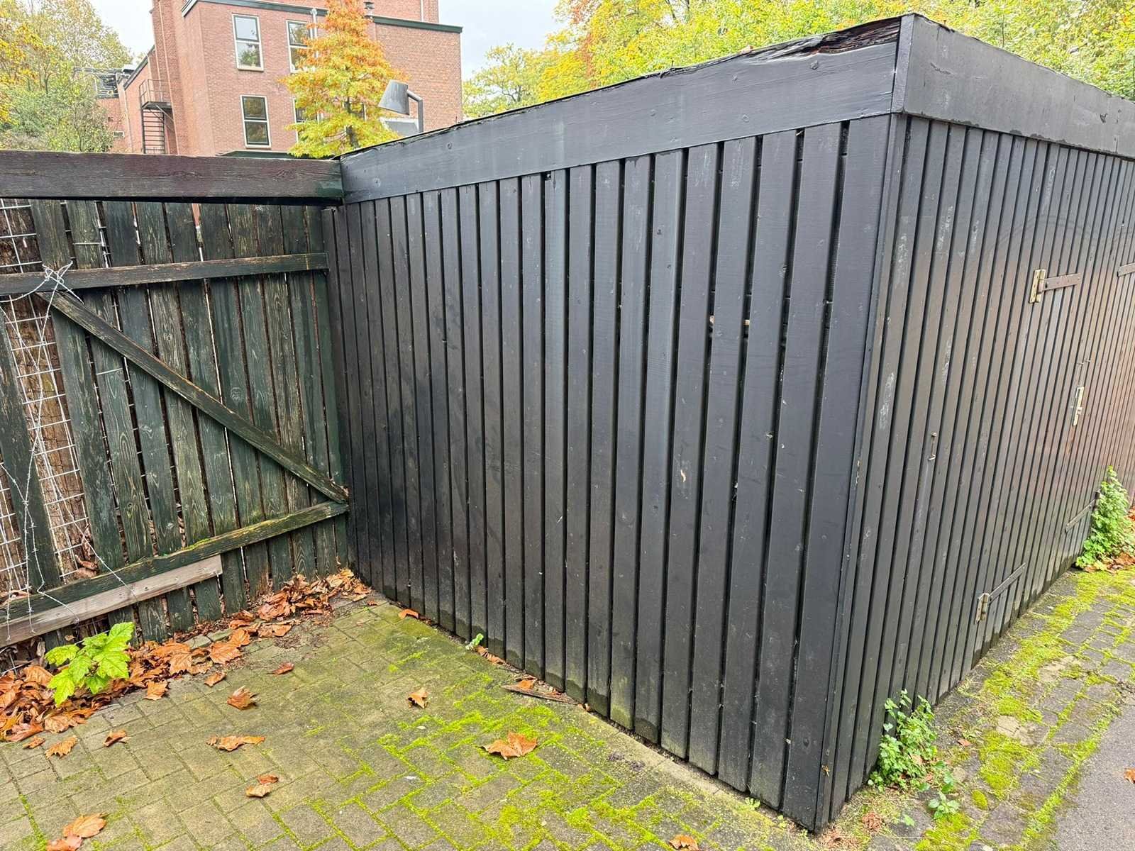Fietsenstalleing, totale lengte ca. 14 meter, breedte 262 cm, hoogtes 198 achterzijde, 212 voorzijde Lengte: 14000cm Breedte: 260cm Hoogte: 198,212cm