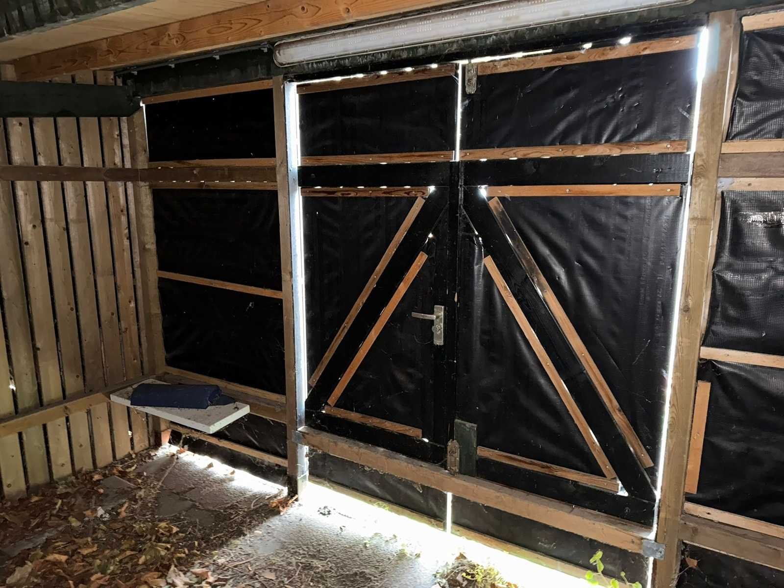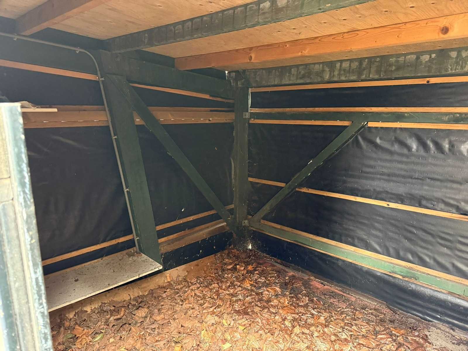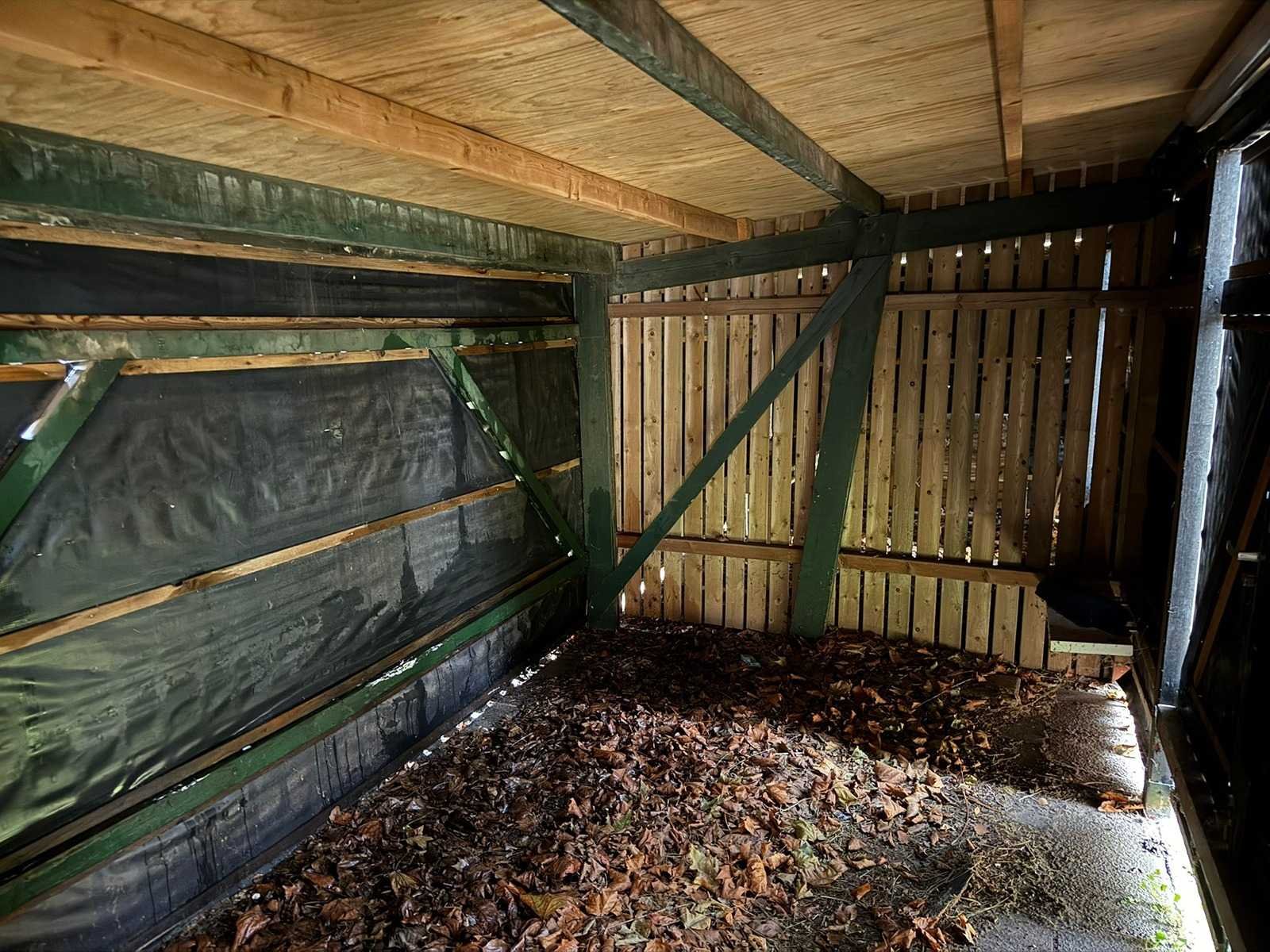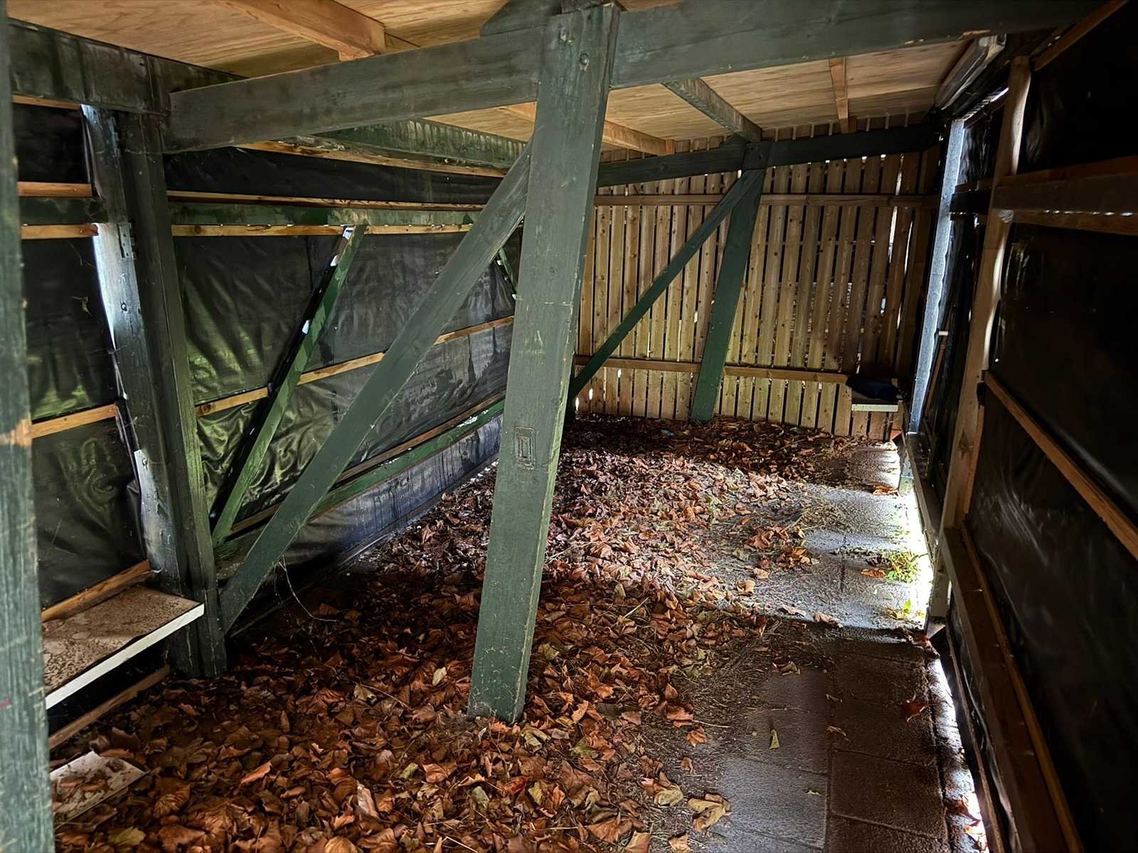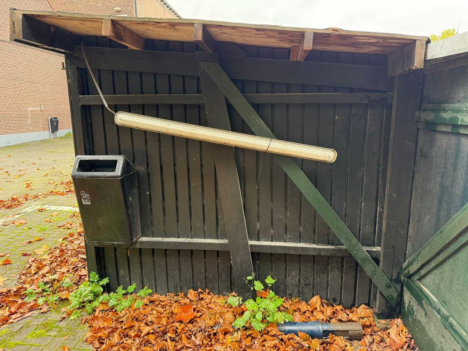 Fietsenstalleing, totale lengte ca. 14 meter, breedte 262 cm, hoogtes 198 achterzijde, 212 voorzijde Lengte: 14000cm Breedte: 260cm Hoogte: 198,212cm