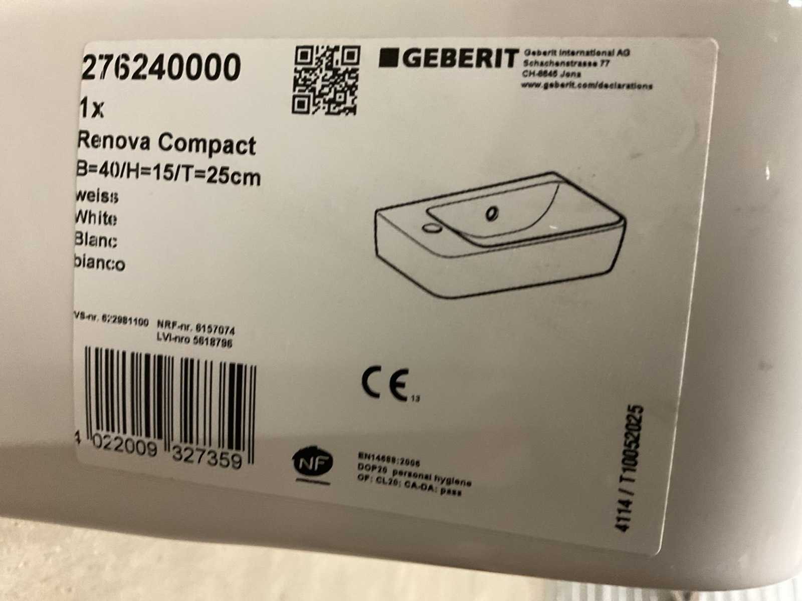 Met kraangat links en overloop. Merk: Geberit Model: Renova Compact Kleur: Wit Lengte: 40cm Breedte: 25cm Hoogte: 15cm