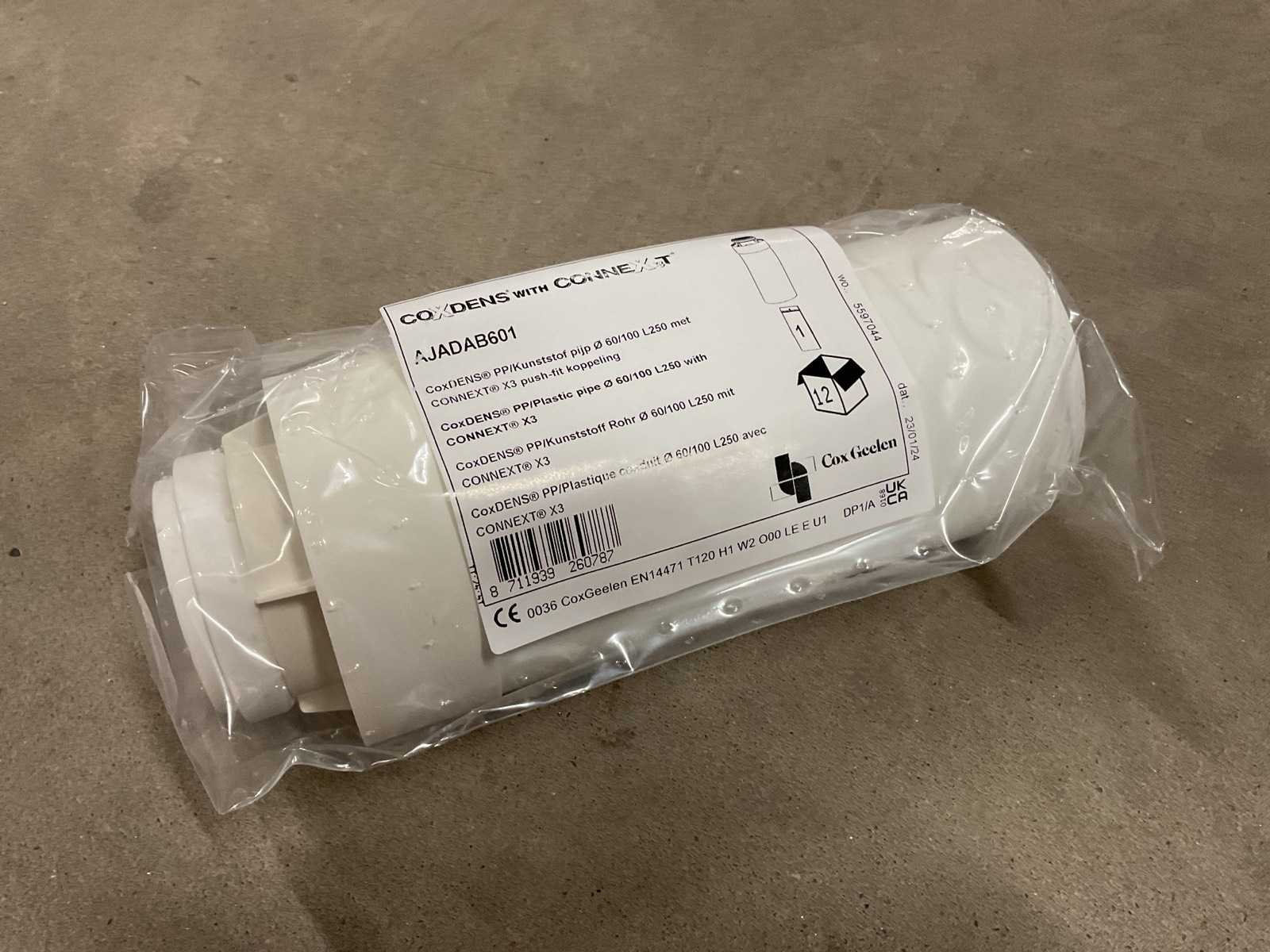 Merk: Cox Geelen Model: Coxdens met Connext 60/100 Product type: AJADAB601 Kleur: RAL9016 Lengte: 25cm Materiaal: PP / kunststof