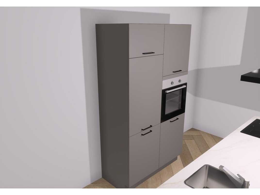 Deze keuken is uitgevoerd in de kleur Taupe met een werkblad van watervast verlijmt kunststof in de kleur Marmer Brons. Inbegrepen: • Oven • Koeler 88 cm • Vaatwasser • Keramisch kookplaat • Afzuiging • Spoelbak • Kraan Afmetingen: F 2232 x 800 (Eiland) 1200mm kastenwand Lengte: 2232 Breedte: 800 Hoogte: 908
