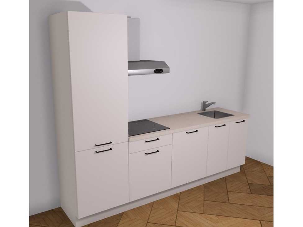 Deze keuken is uitgevoerd in de kleur Zand met een werkblad van watervast verlijmt kunststof in de kleur Beton Zand. Inbegrepen: • Vaatwasser • Keramisch kookplaat • Afzuiging • Spoelbak • Kraan Lengte: 2600 Breedte: 600 Hoogte: 908