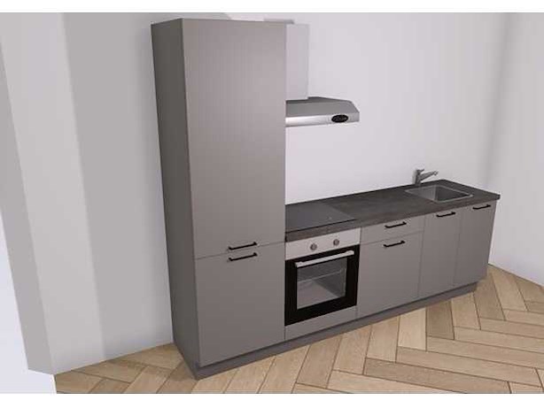 Deze keuken is uitgevoerd in de kleur Cool Grey met een werkblad van watervast verlijmt kunststof in de kleur Beton Zwart. Inbegrepen: • Oven • Keramisch kookplaat • Afzuiging • Spoelbak • Kraan Lengte: 2600 Breedte: 600 Hoogte: 908