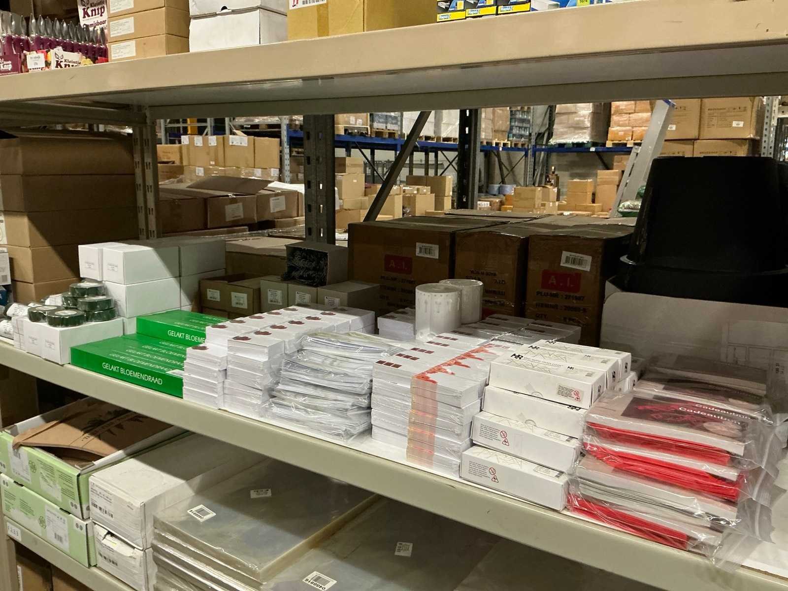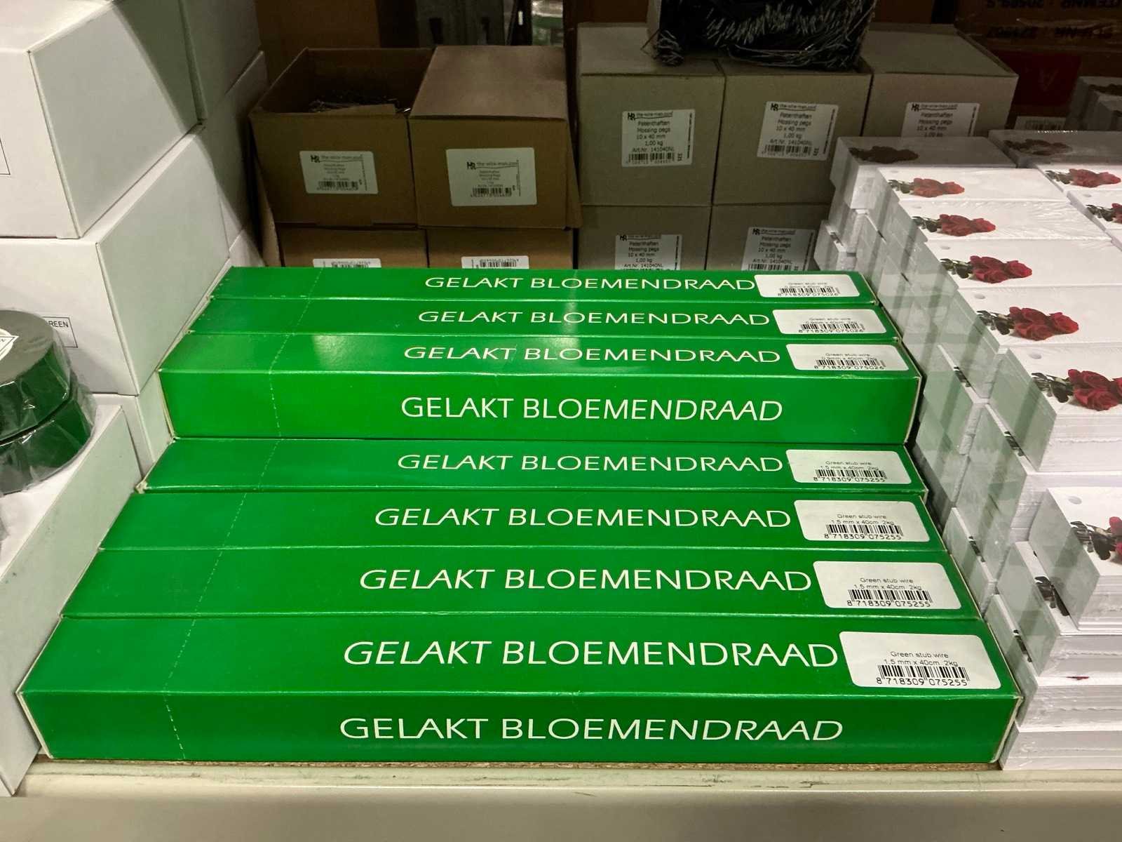 303 verpakkingen. O.a : gelakt bloemendraad, flower tape, mossing pegs, kaartjes, naalden etc.