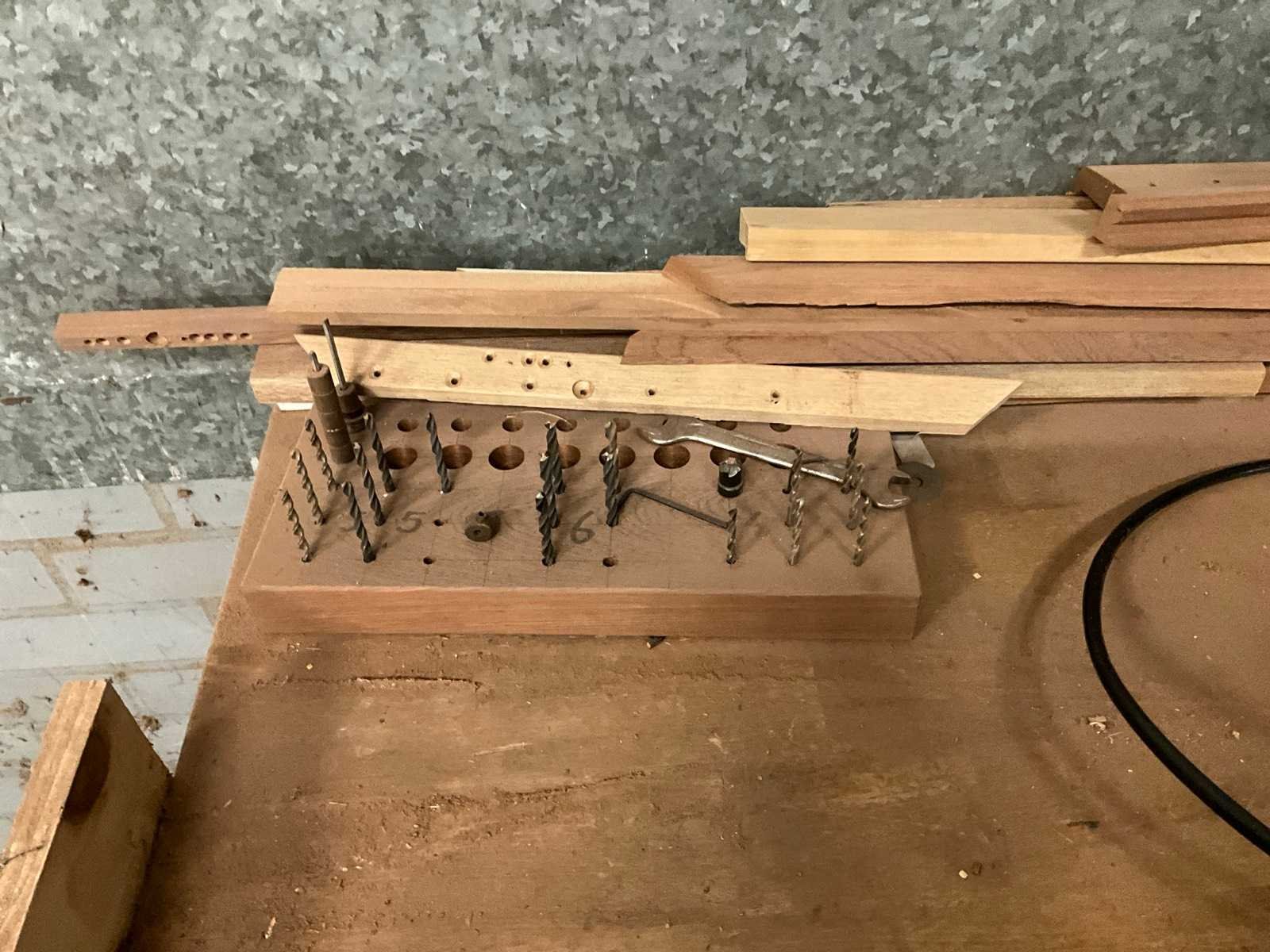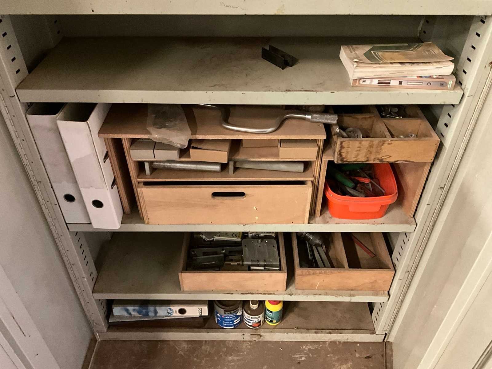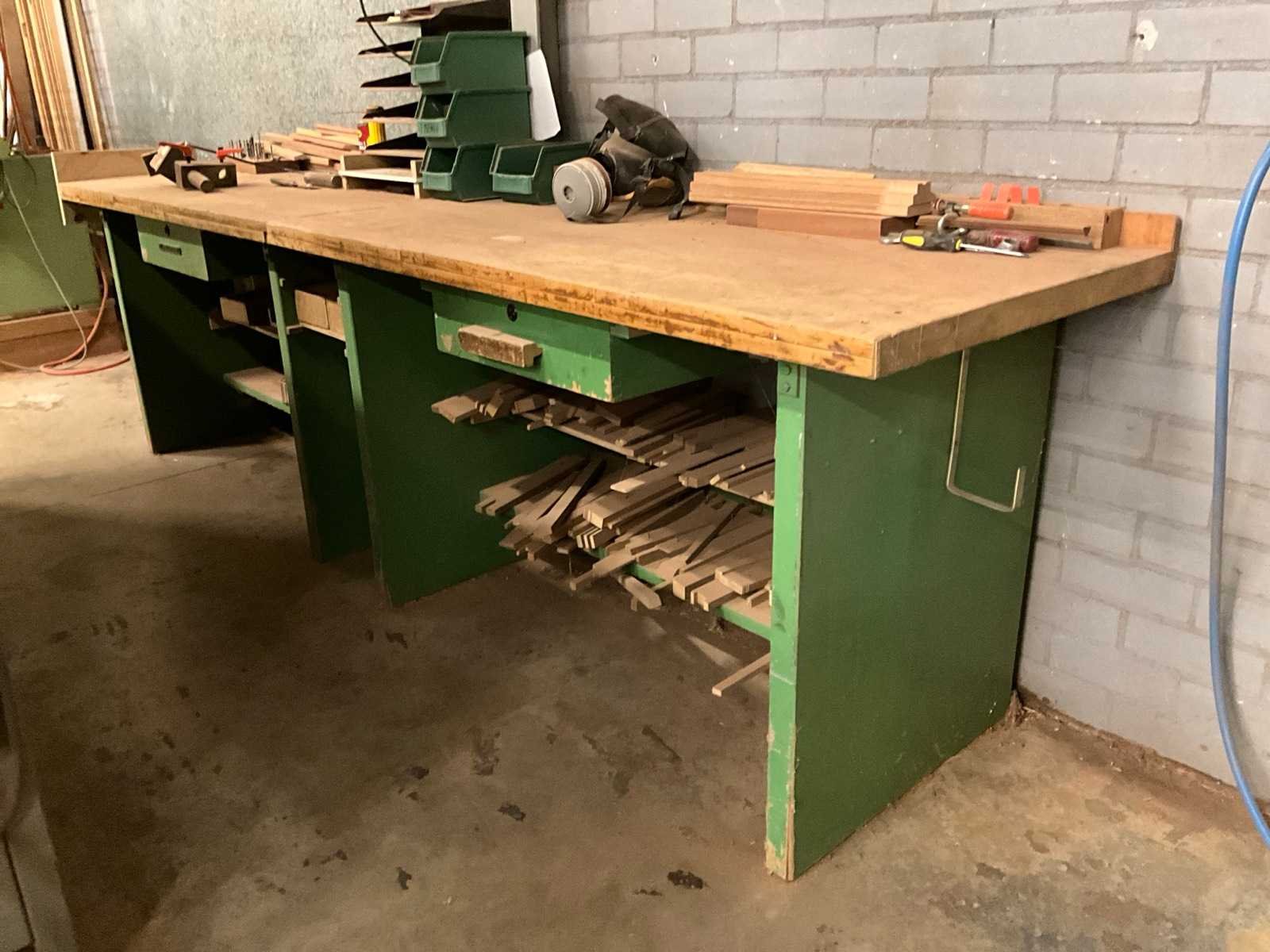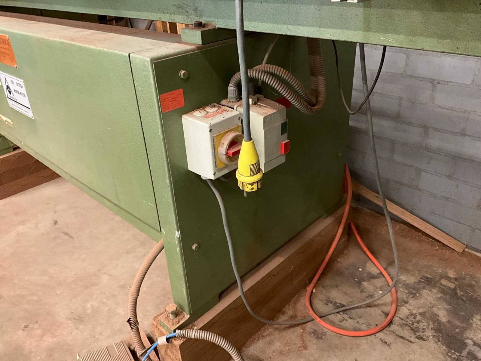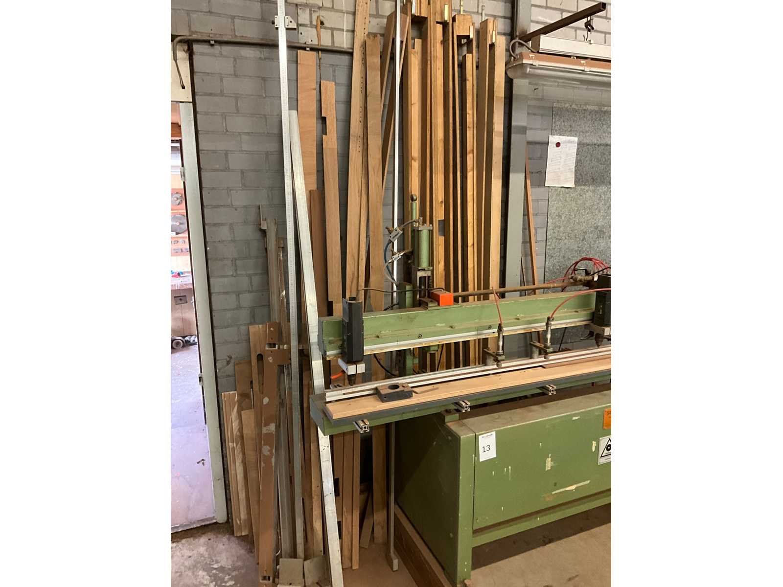 Voorzien van voetbediening, 4 boorspindels; rails 2500mm; inclusief metalen tweedeurskast met inhoud, diverse houten en metaal latten/mallen en dubbele houten werkbank H85xB85xL150cm Merk: Schleicher Type: GL6/2500 Bouwjaar: 1988 Serienummer: 354890 Aansluiting: 230V