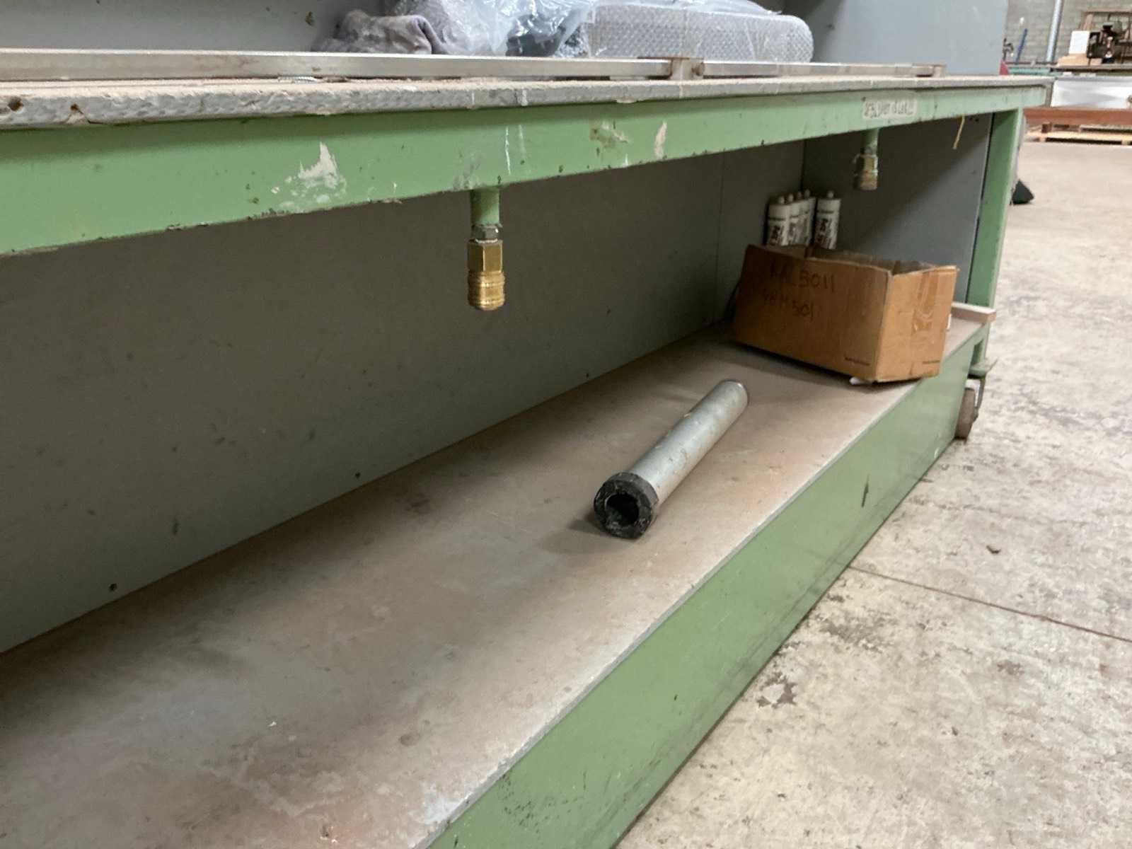 Verrijdbaar, stalen frame met houten blad, Voorzien van luchtaansluitingen aan beide kanten, werkblad hoogte 74cm Model: Verrijdbare Breedte: 3530mm Lengte: 1260mm Hoogte: 2300mm
